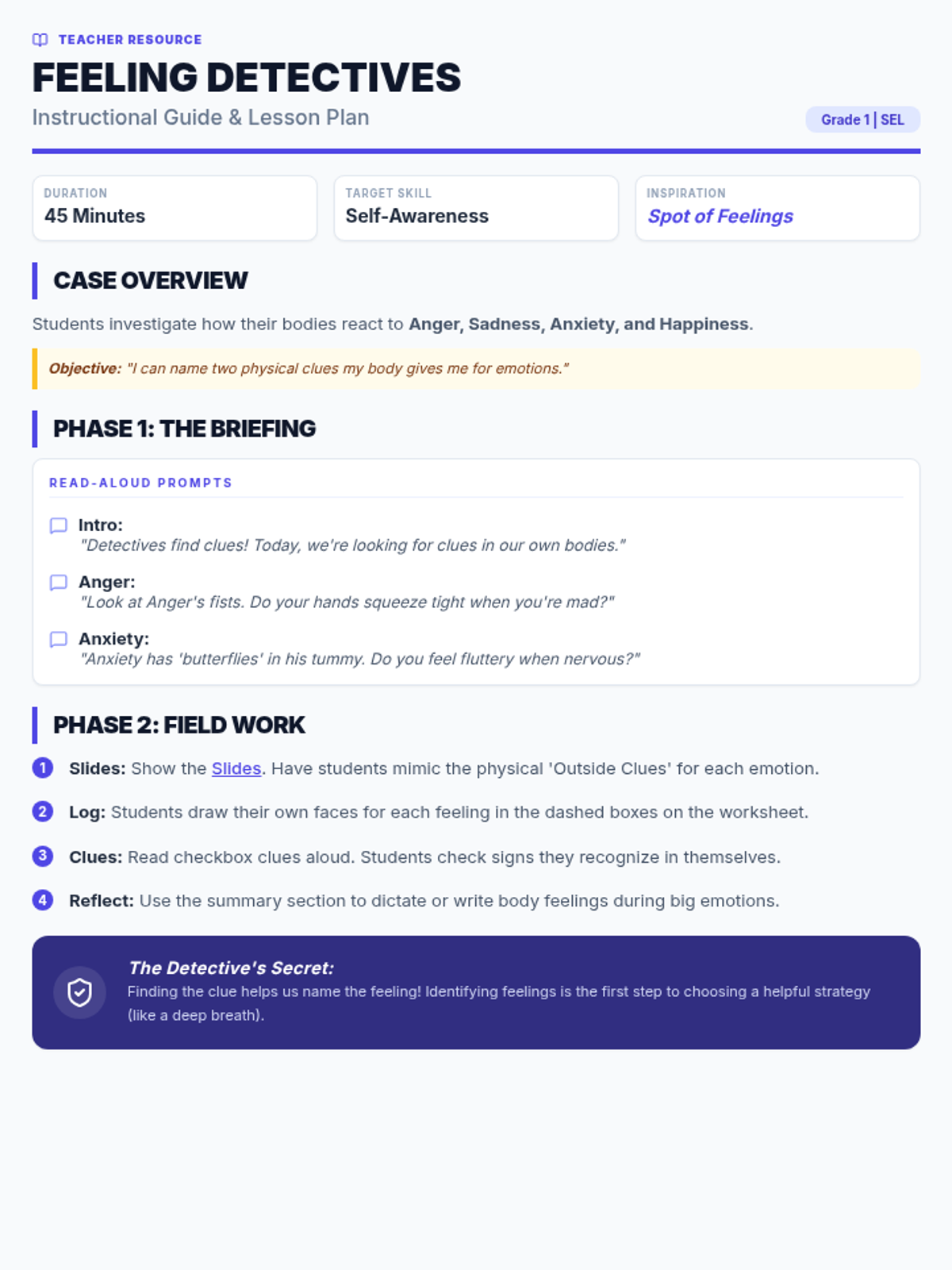 A teacher guide for the 'Feeling Detectives' lesson. Includes lesson duration, learning objectives, read-aloud discussion prompts, and step-by-step activity instructions for the worksheet and slides.