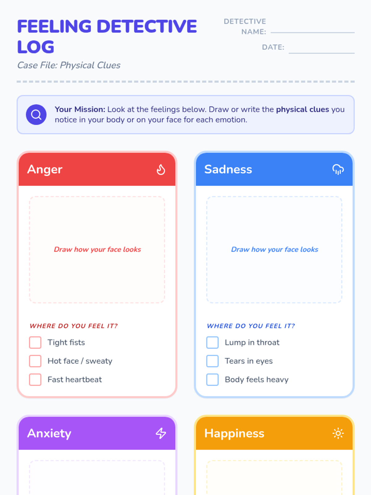 A two-page student worksheet designed for first graders to identify and record physical clues (facial expressions and body sensations) for four primary emotions. Features a detective-themed layout with drawing areas and checkbox clues.