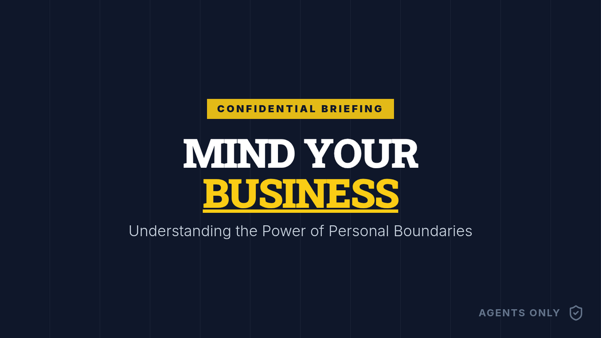 A visually striking presentation for a group session on boundaries, featuring definitions, types of boundaries (physical, emotional, digital), and scenario-based discussion prompts with a 'confidential agent' theme.