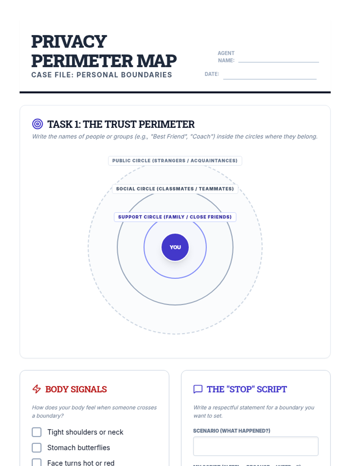 A student worksheet for identifying personal boundaries, featuring a 'Circles of Trust' mapping activity, a checklist for bodily signals of boundary violations, and a section for practicing assertive communication.