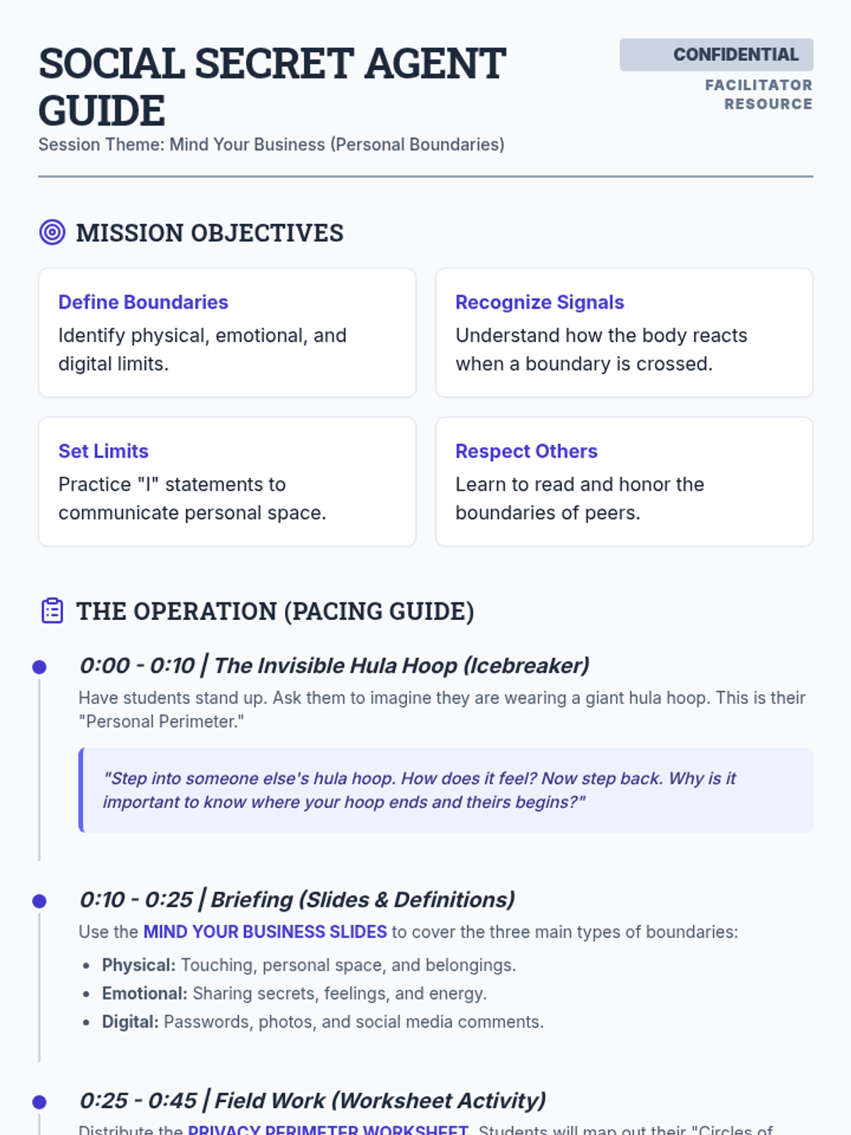 A facilitator guide for a group counseling session on boundaries, featuring a pacing guide, icebreaker activities, and discussion prompts with a 'confidential agent' theme.