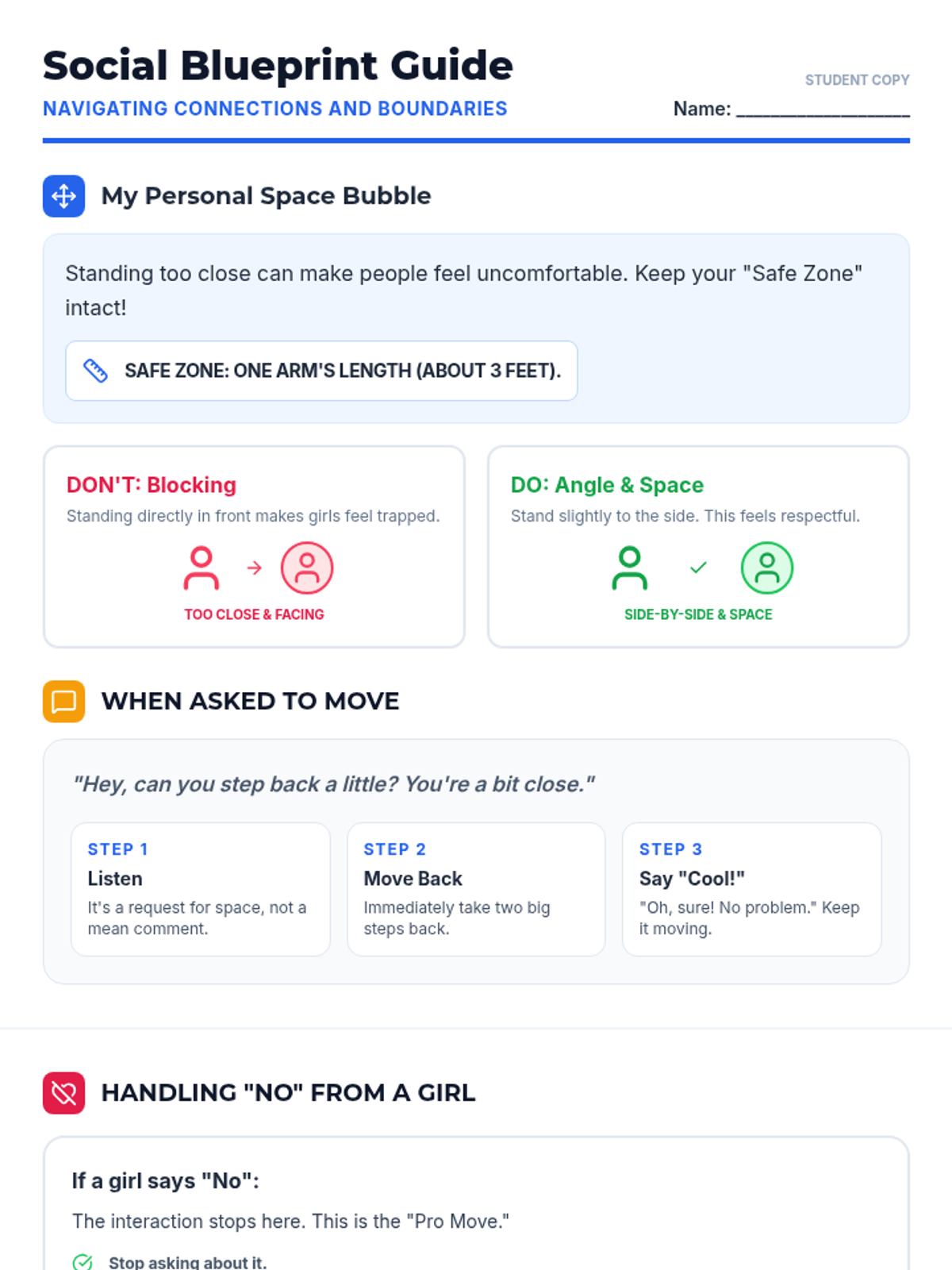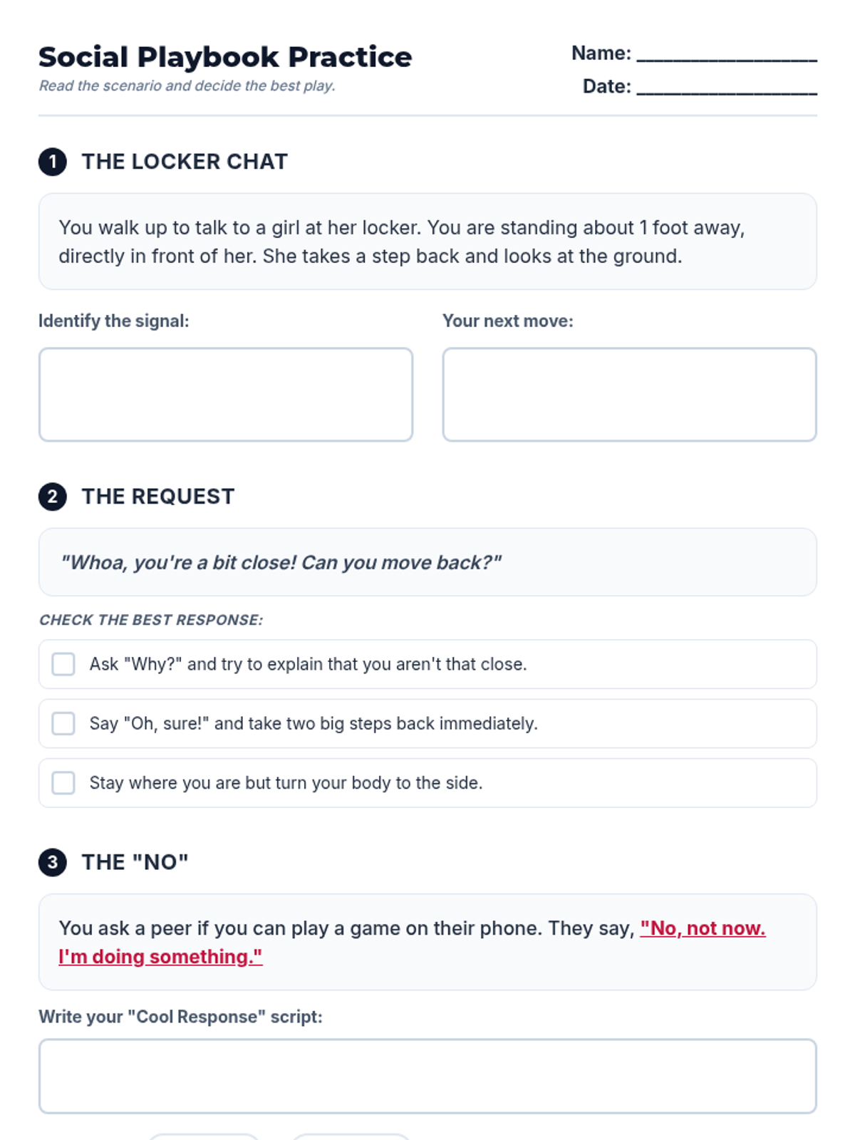 A discussion and activity sheet presenting school-based social conflict scenarios for perspective-taking practice.