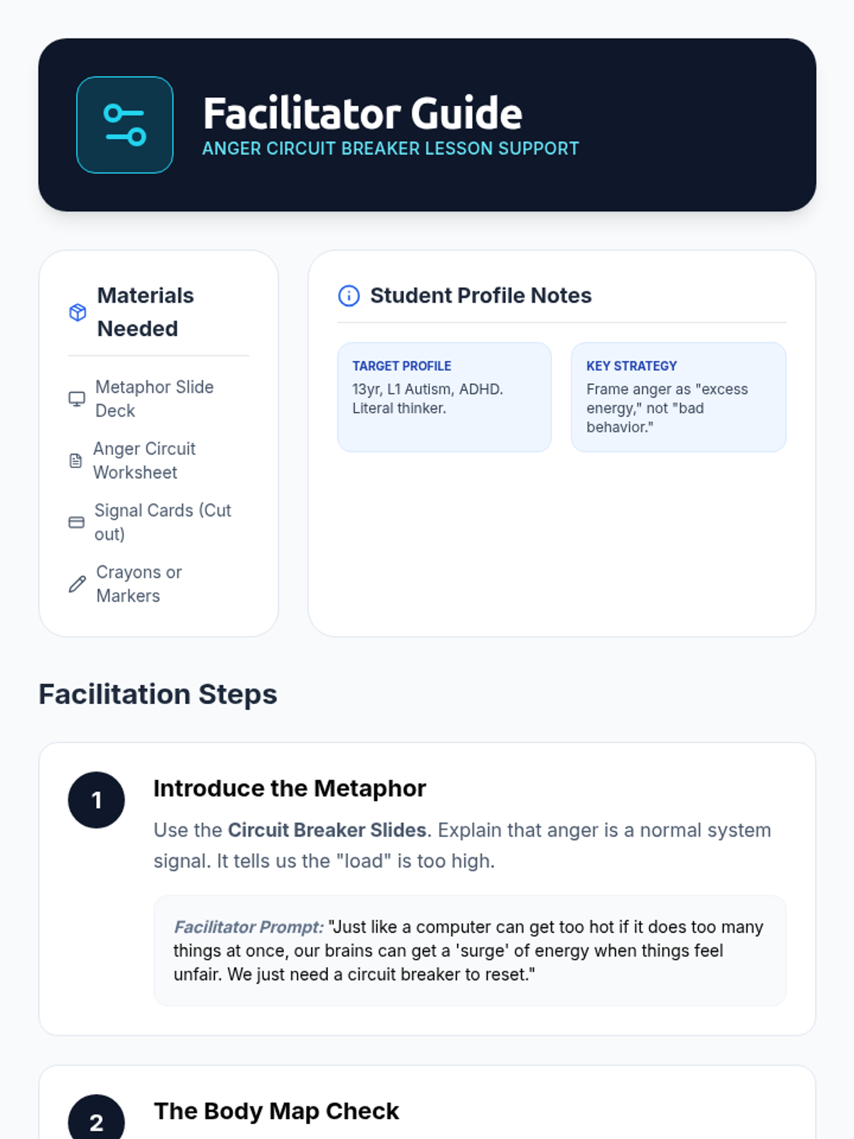 A facilitator guide for teachers or therapists. It provides a literal script for explaining the circuit breaker metaphor, tips for supporting students with interoception challenges, and differentiation strategies for ADHD and ID profiles.