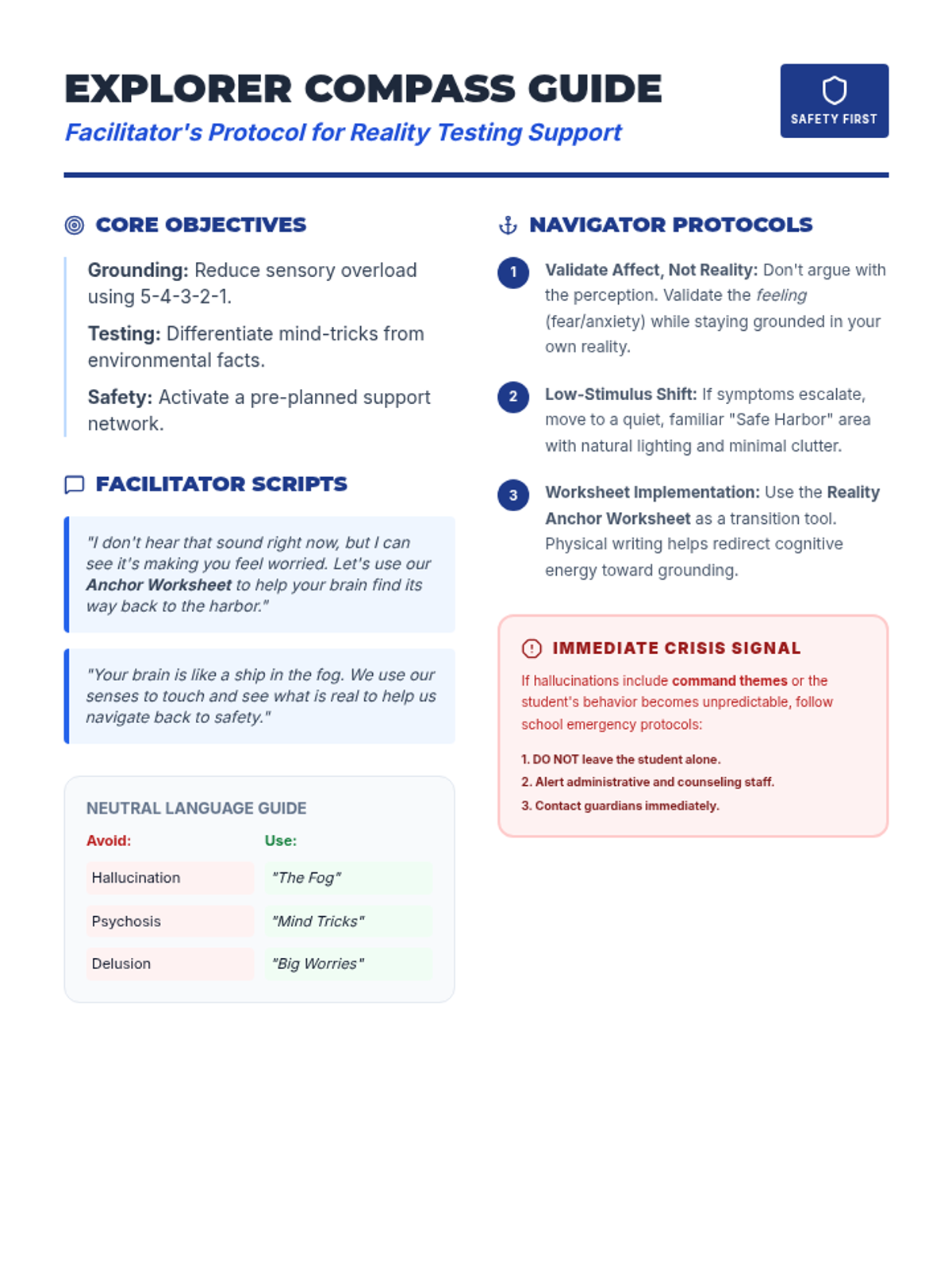 A facilitator's guide providing educators and counselors with strategies for supporting students with psychotic features. Includes language tips, validation techniques, and scripts for guiding students through grounding exercises.