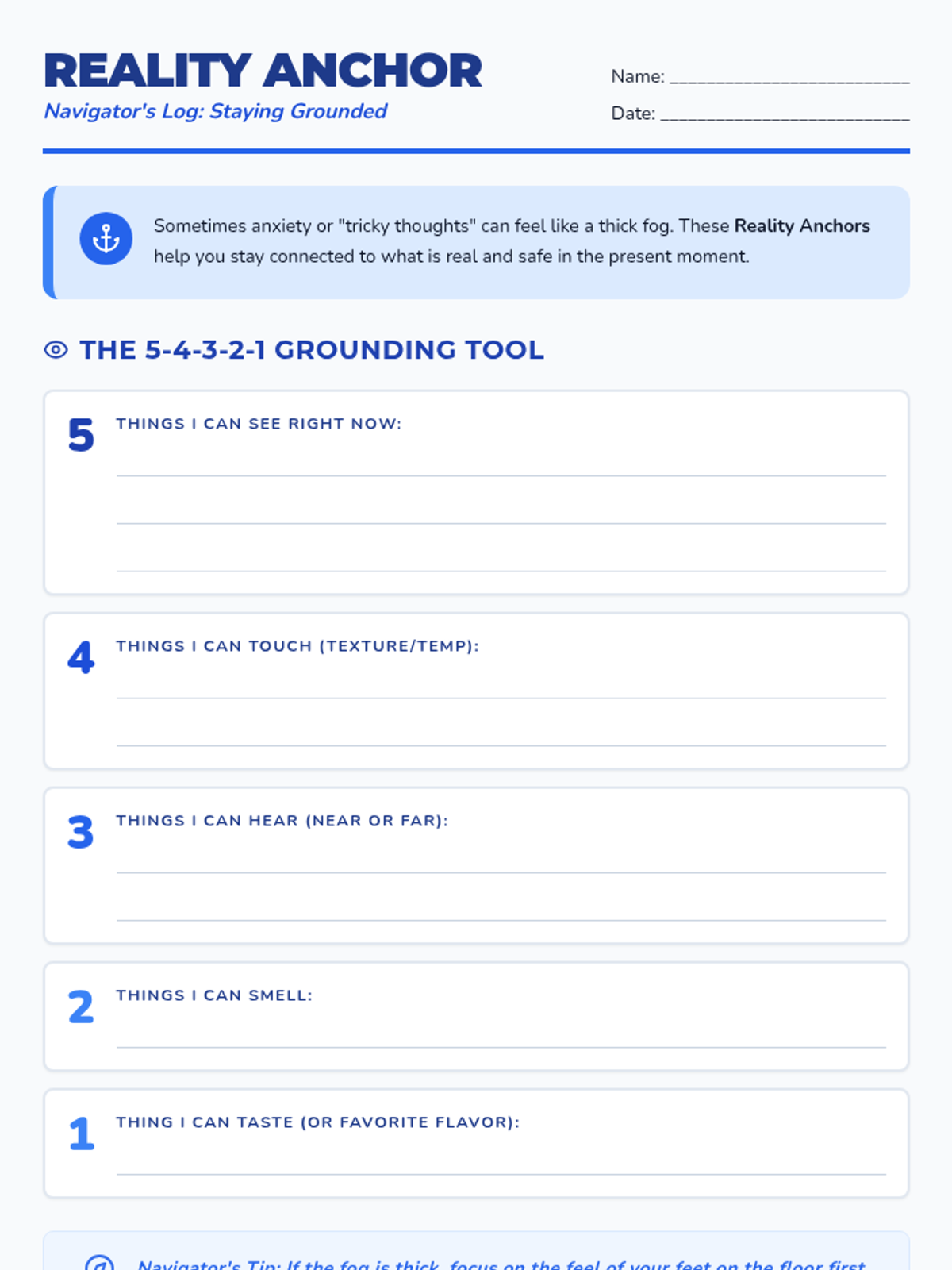 An engaging student worksheet using a nautical theme to teach the 5-4-3-2-1 grounding technique and simple reality testing strategies. Includes sections for identifying safe people and positive self-talk.