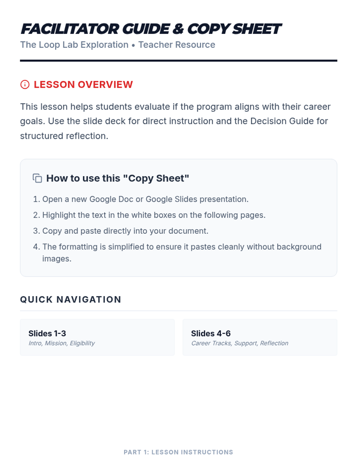 A teacher-facing resource providing the instructional context for the lesson and simplified, structured text content for easy copying into Google Docs or Google Slides.