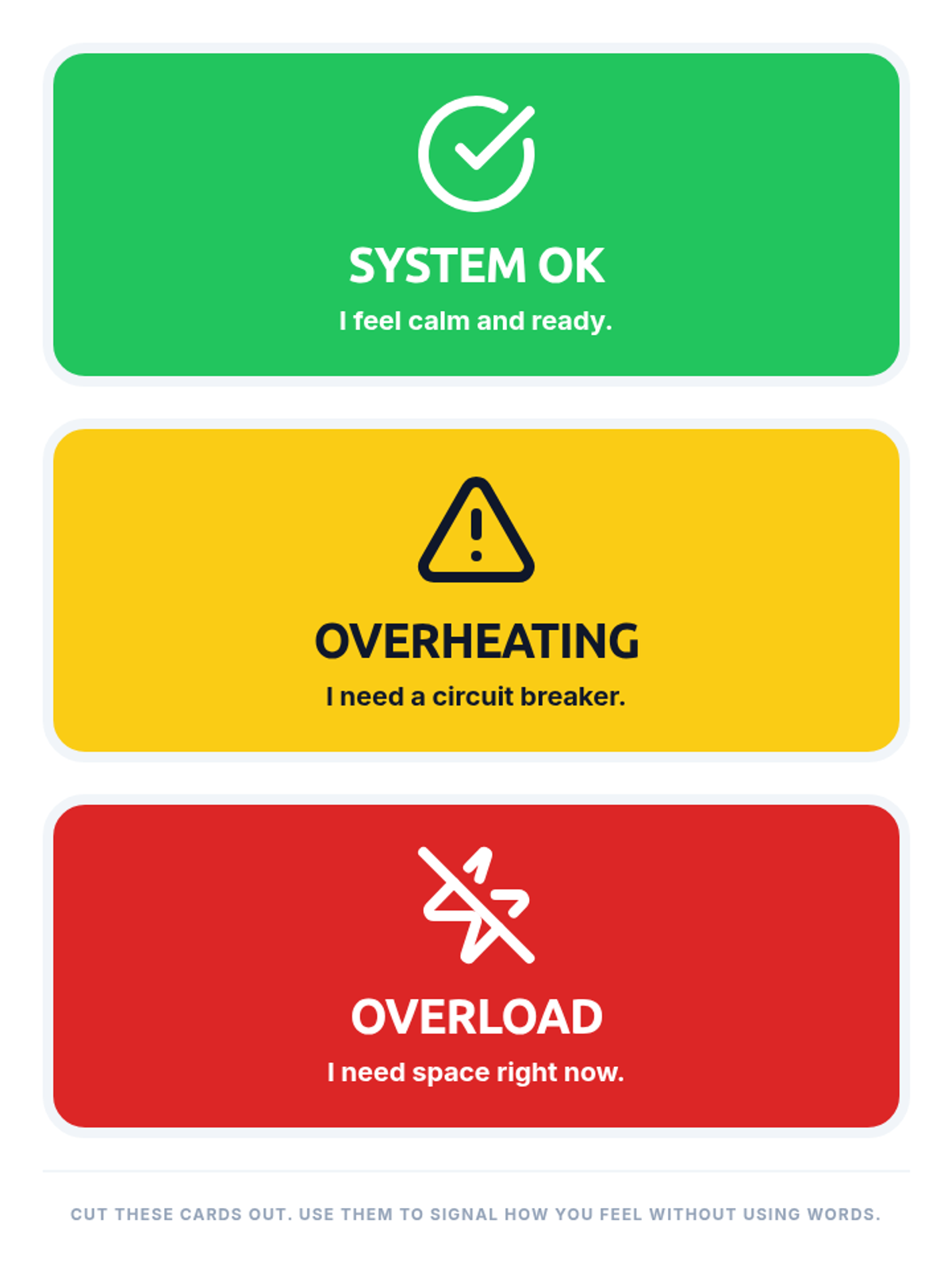 A set of large-format communication cards (Green, Yellow, Red) using the system metaphor. These allow the student to non-verbally signal their emotional state to teachers or parents.