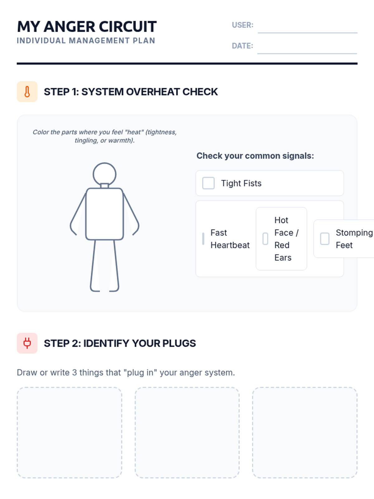 A student-facing worksheet for anger management. It includes a body-mapping activity to identify physical signs of anger, a space to identify personal triggers, and a selection tool for coping strategies.