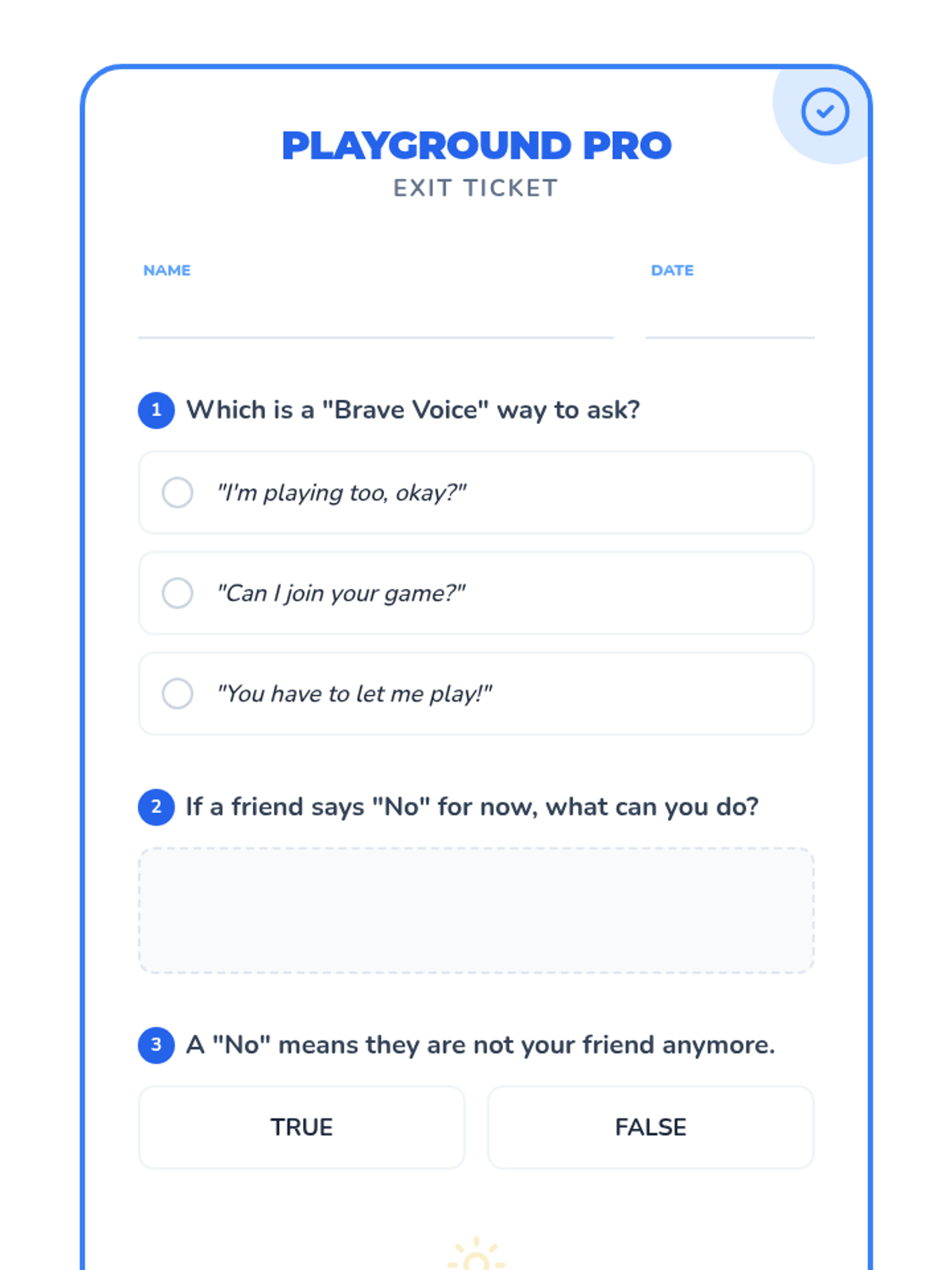 A quick formative assessment to check student understanding of the Playground Pals lesson. It includes multiple-choice questions on using a 'brave voice', a short-answer section for brainstorming 'Plan B' options, and a true/false question to normalize hearing 'no'.