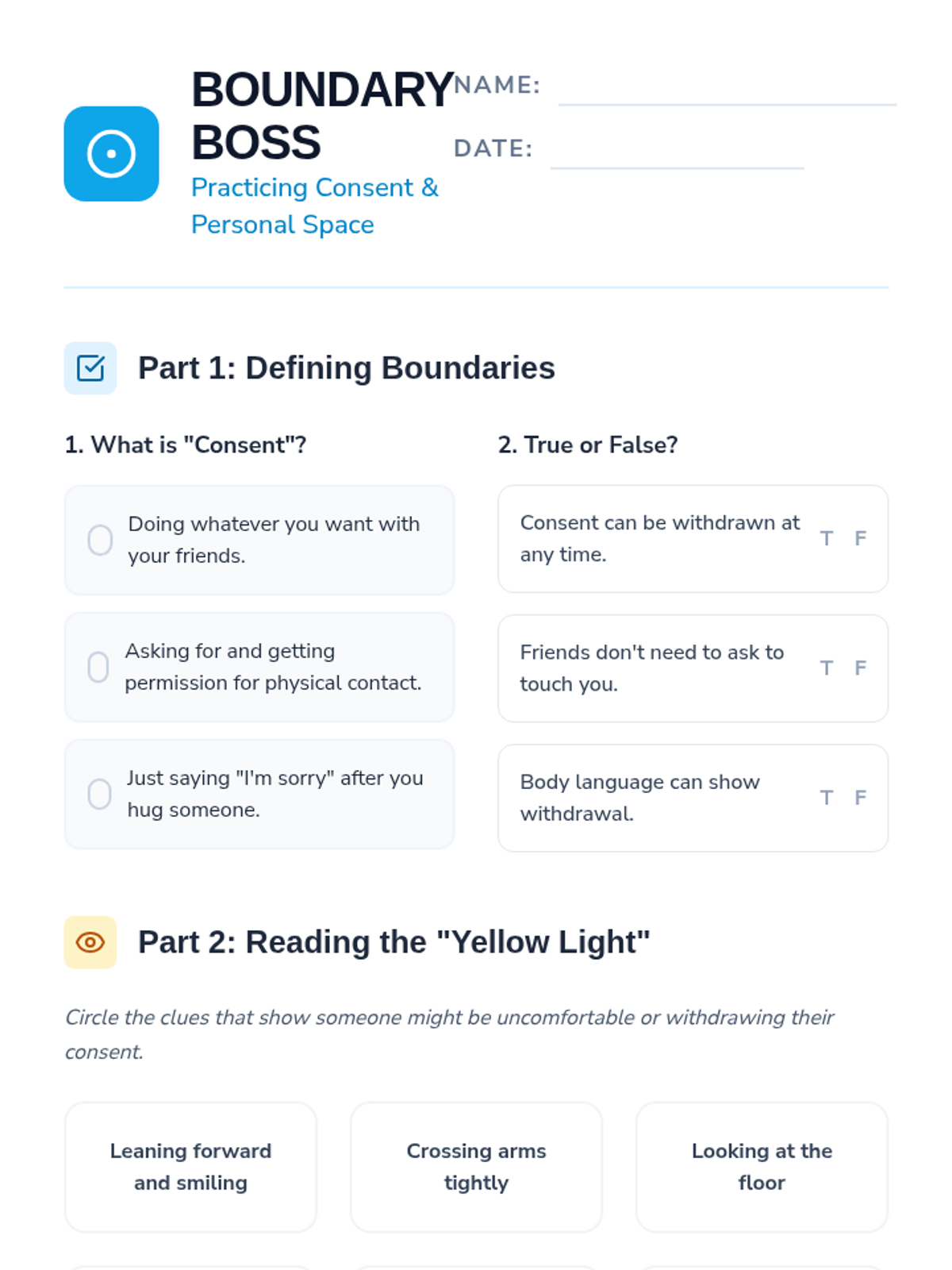 A student worksheet focused on identifying consent, reading non-verbal cues for withdrawal, and applying respectful communication in social scenarios.