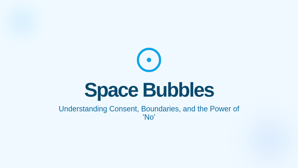 A set of instructional slides teaching students about personal space bubbles, the definition of consent, non-verbal cues for withdrawal, and how to respectfully handle a 'no'.