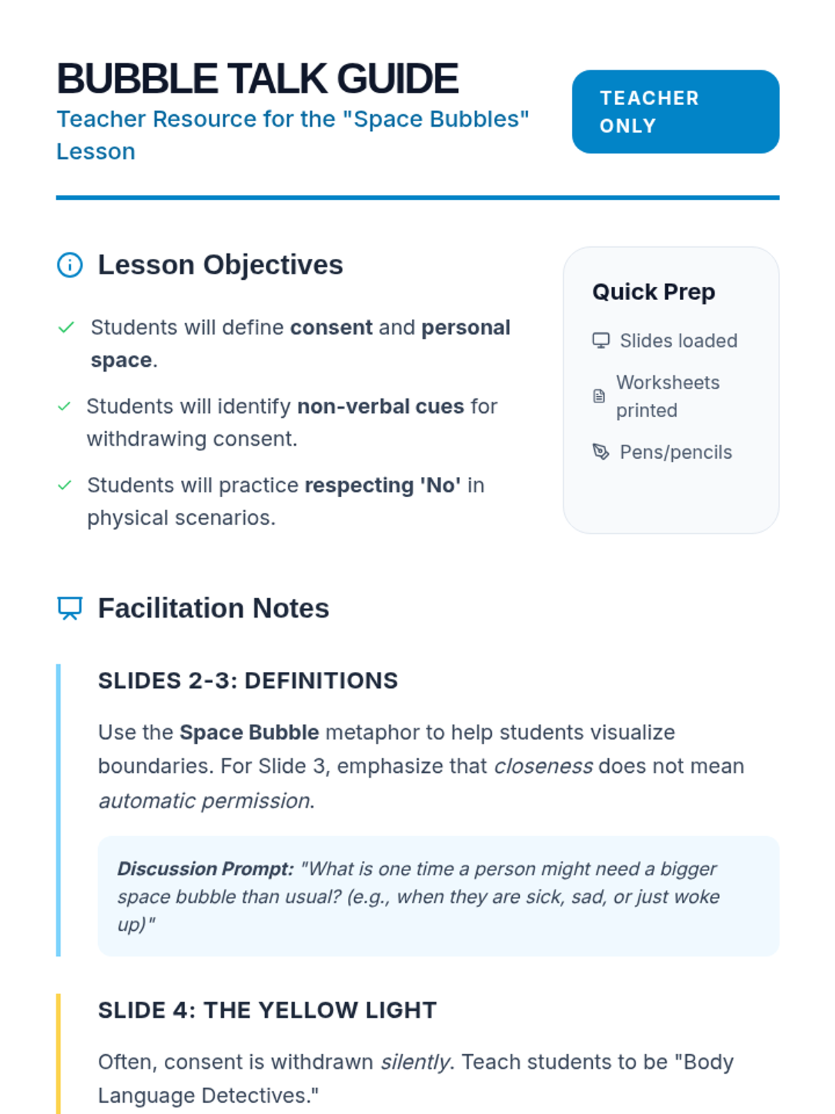 A facilitation guide for teachers including slide notes, discussion prompts, role-play scenarios, and a worksheet answer key.