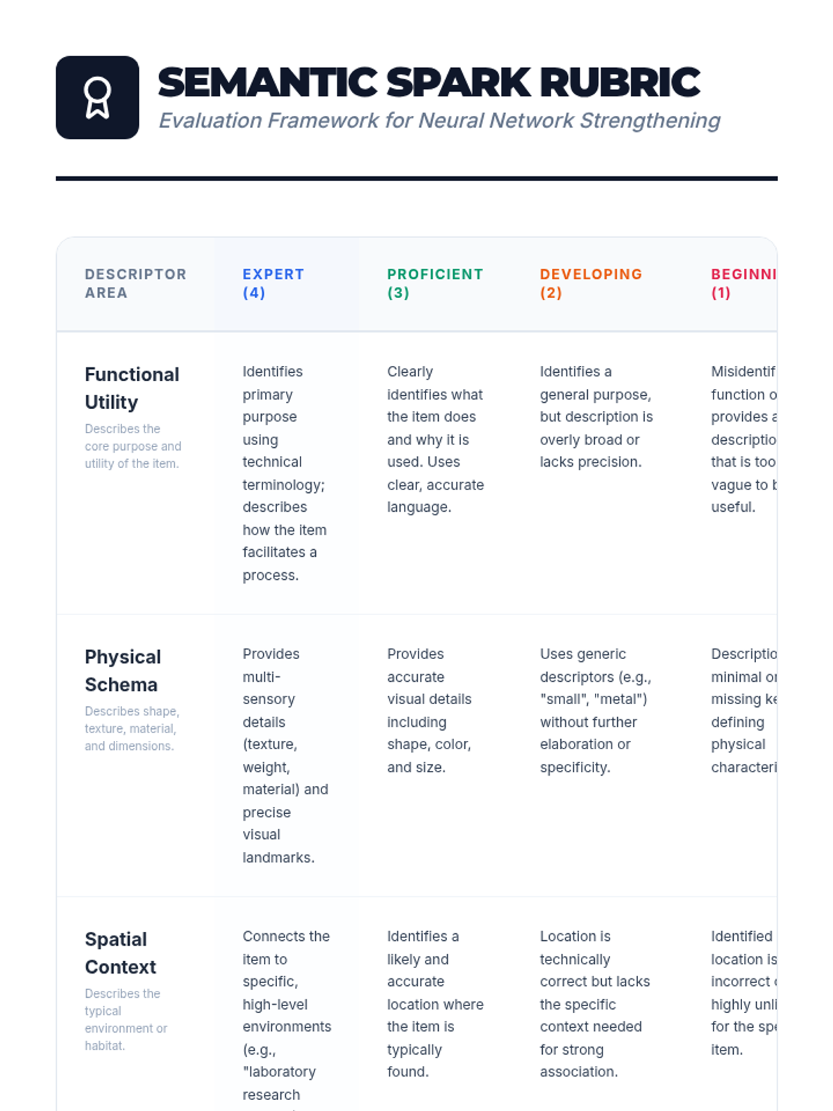 A comprehensive assessment rubric for evaluating student semantic networking responses. Features criteria for functional utility, physical schema, spatial context, and lexical precision on a 4-point scale.