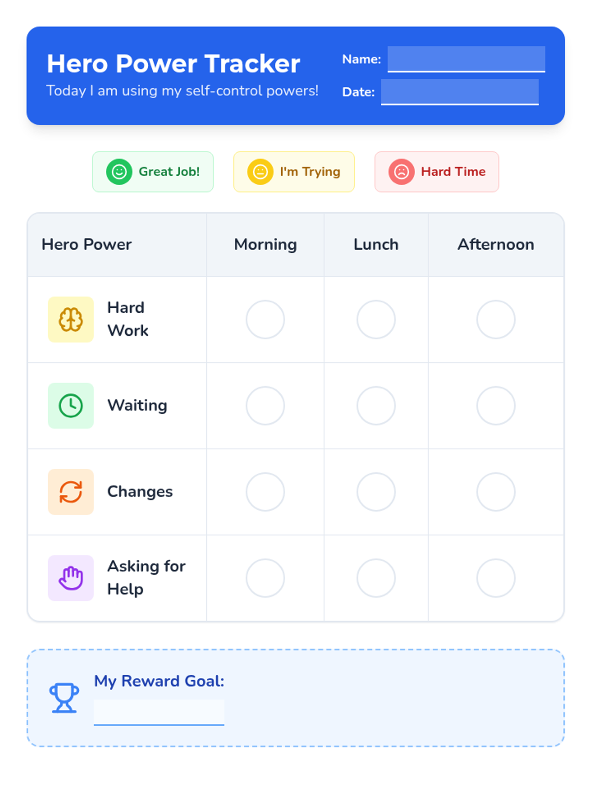 A visual behavior tracking chart for self-monitoring daily self-control skills, divided by time of day with simple icons for 4th-grade students.