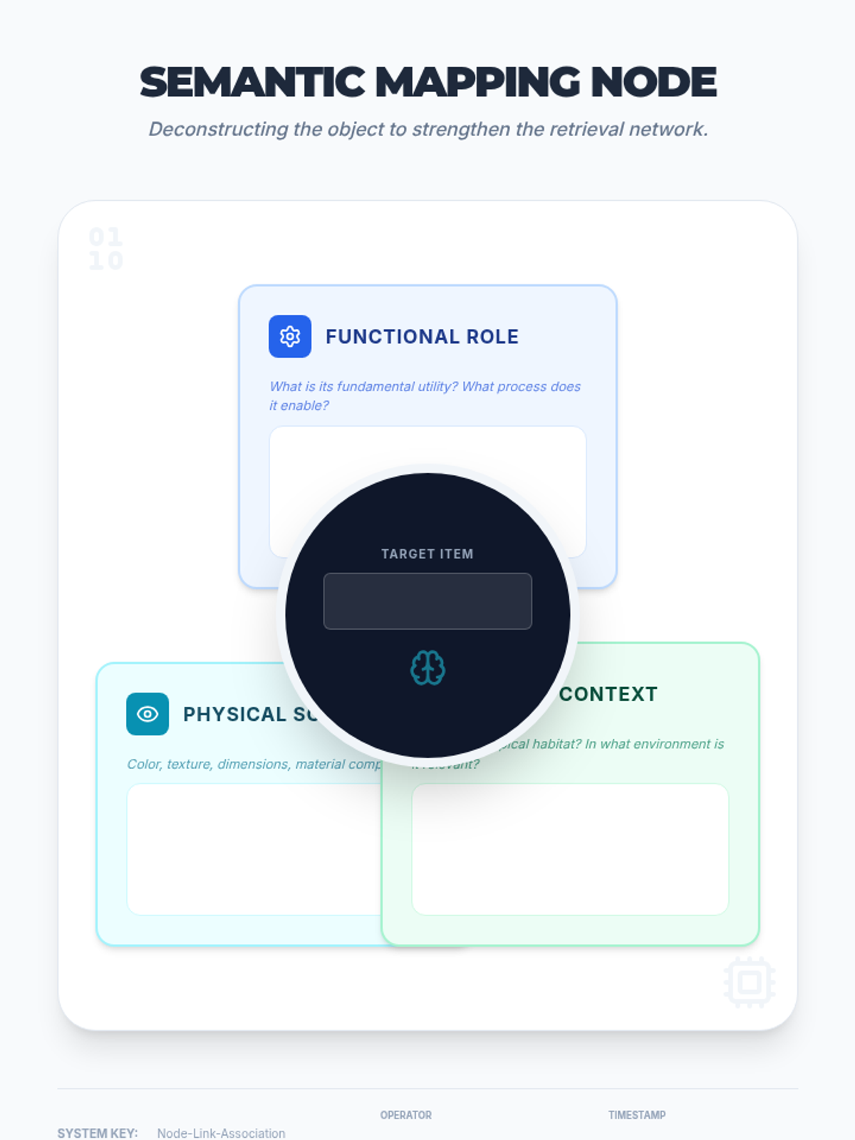 A reusable semantic mapping graphic organizer for high school students. It features a central node for an item name and three radiating sections for Function, Appearance, and Location, designed with a modern blueprint aesthetic.