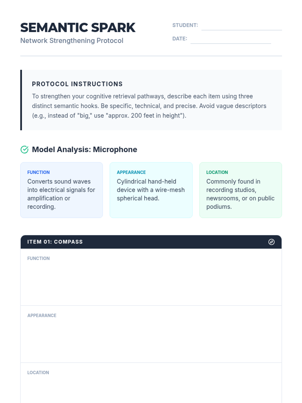 A high-impact visual presentation featuring seven items for students to describe using the semantic networking framework of function, appearance, and location. Includes a modeled example and clear visual prompts to guide high school learners.