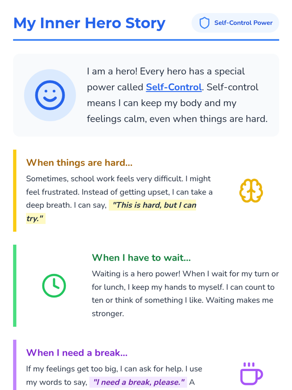 A simplified social story designed for a 4th-grade student with limited cognitive skills, focusing on managing frustration, waiting, asking for breaks, and handling changes.
