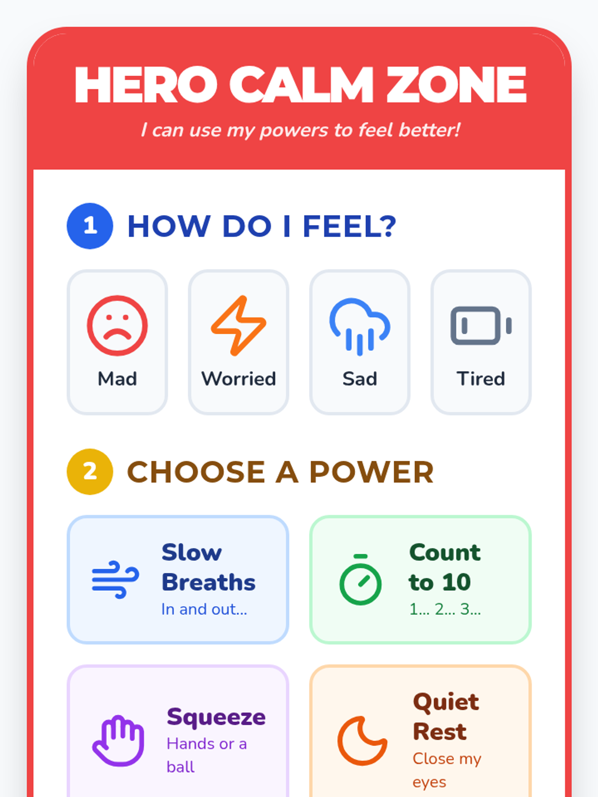 A visual aid poster for a calm-down corner, featuring simple numbered steps, emotional check-ins, and coping strategies with large icons for 4th-grade students.