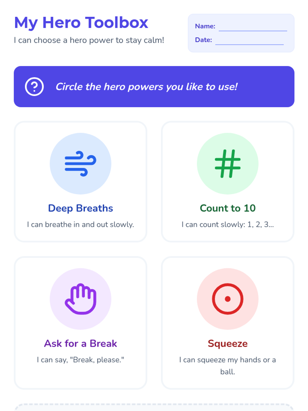 A visual worksheet featuring coping strategies with simple icons and text, including a space for students to identify and draw their preferred calm-down method.