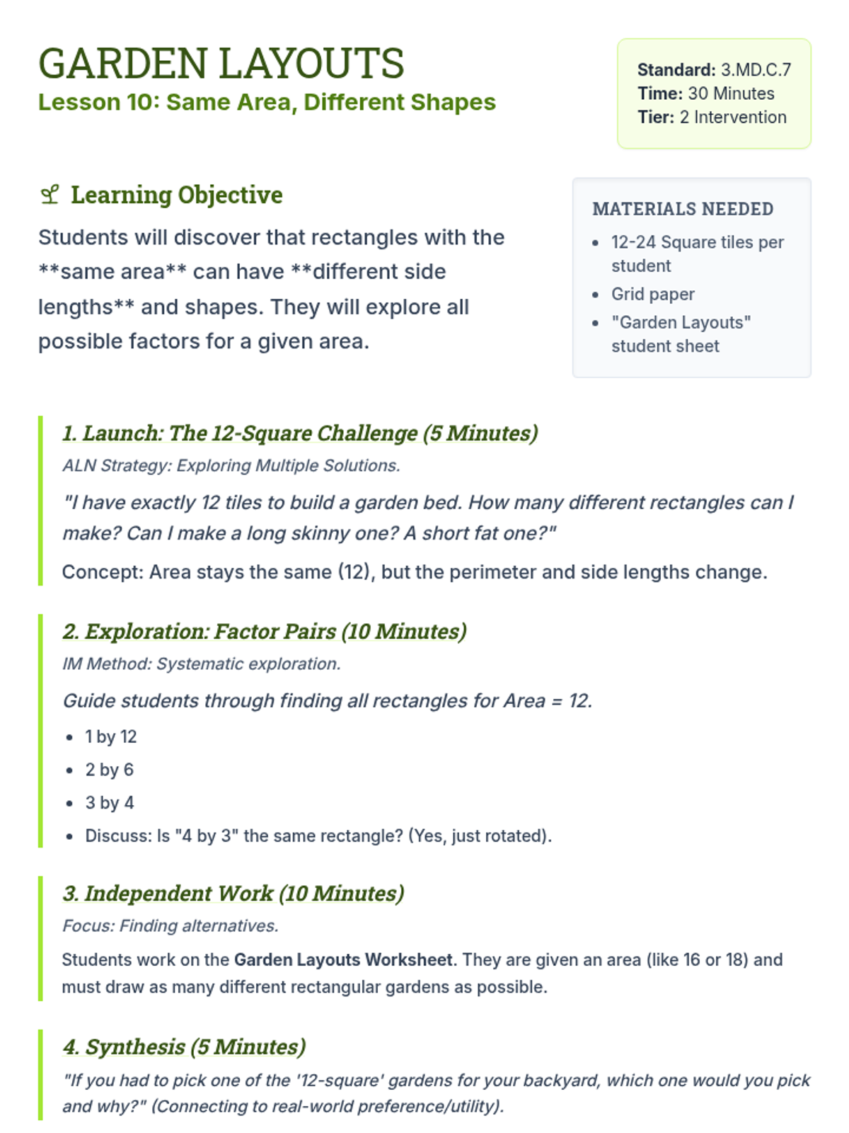 Teacher's guide for Lesson 10 which explores the concept that rectangles with the same area can have different side lengths.