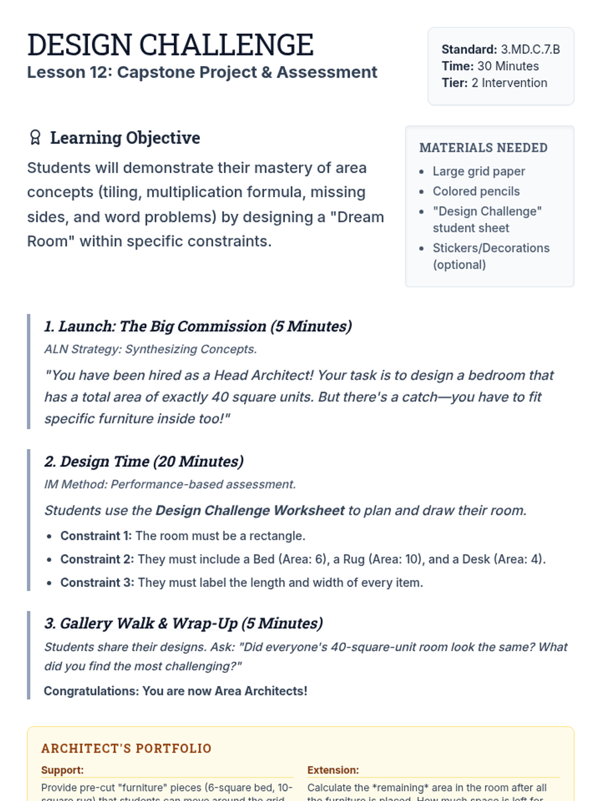 Teacher's guide for the final lesson in the sequence, a cumulative design project where students apply all area concepts to create a "Dream Room" within constraints.