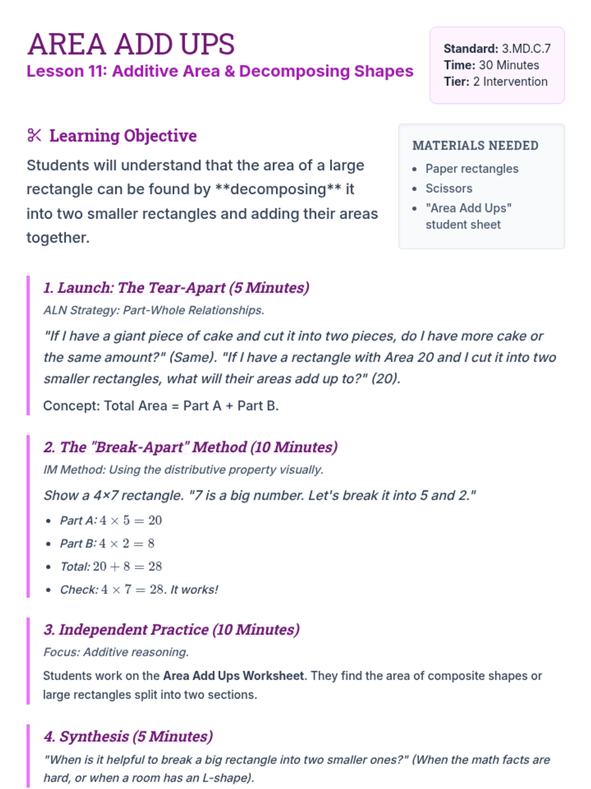 Teacher's guide for Lesson 11 focusing on additive area and decomposing rectangles into smaller parts to find the total area.