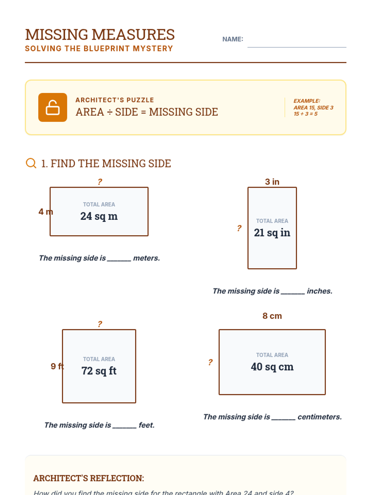 Student worksheet for Lesson 9 focusing on finding missing side lengths given the area and one side length.