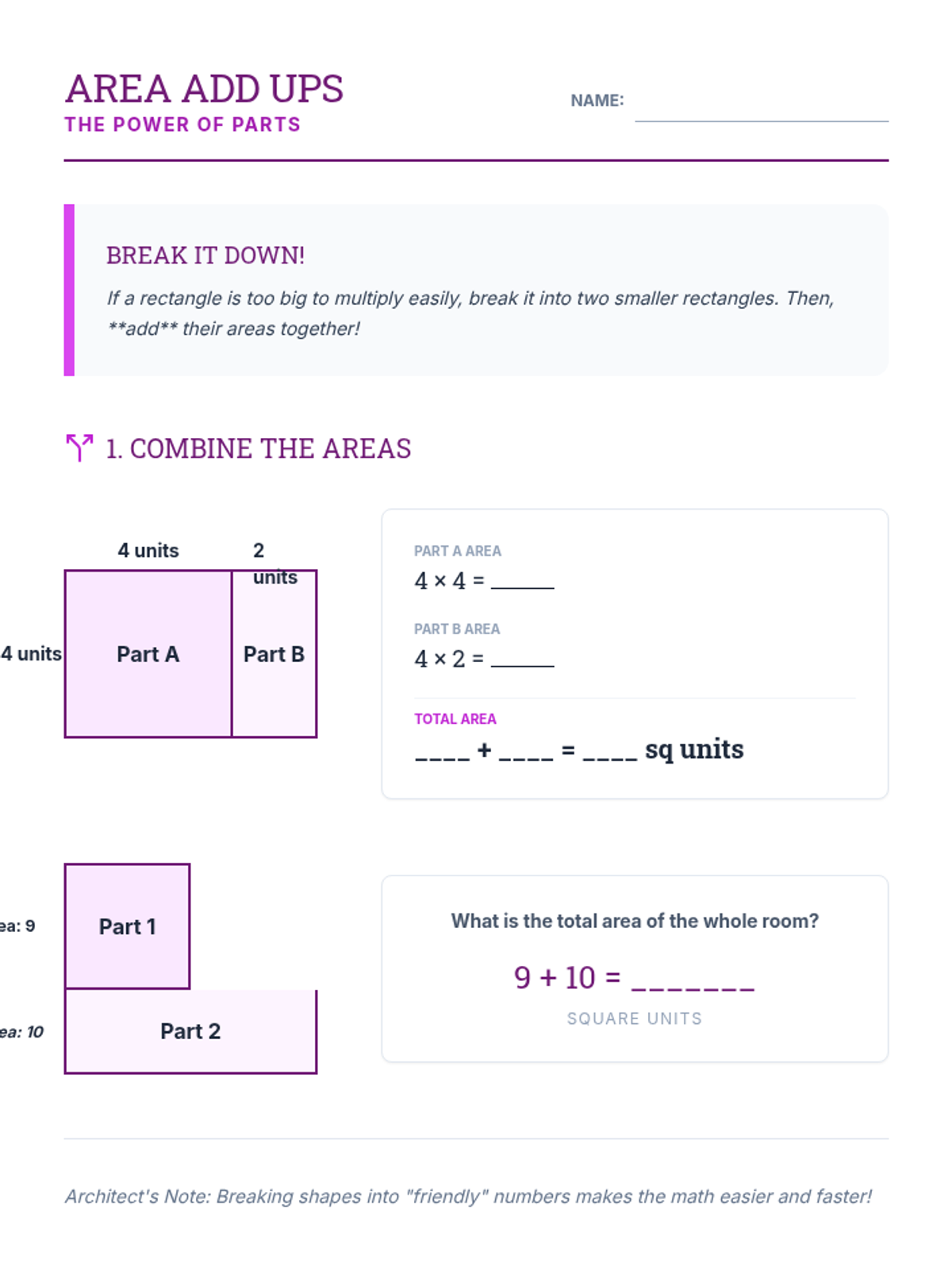 Student worksheet for Lesson 11 where students practice finding the total area of composite or decomposed shapes by adding partial areas.