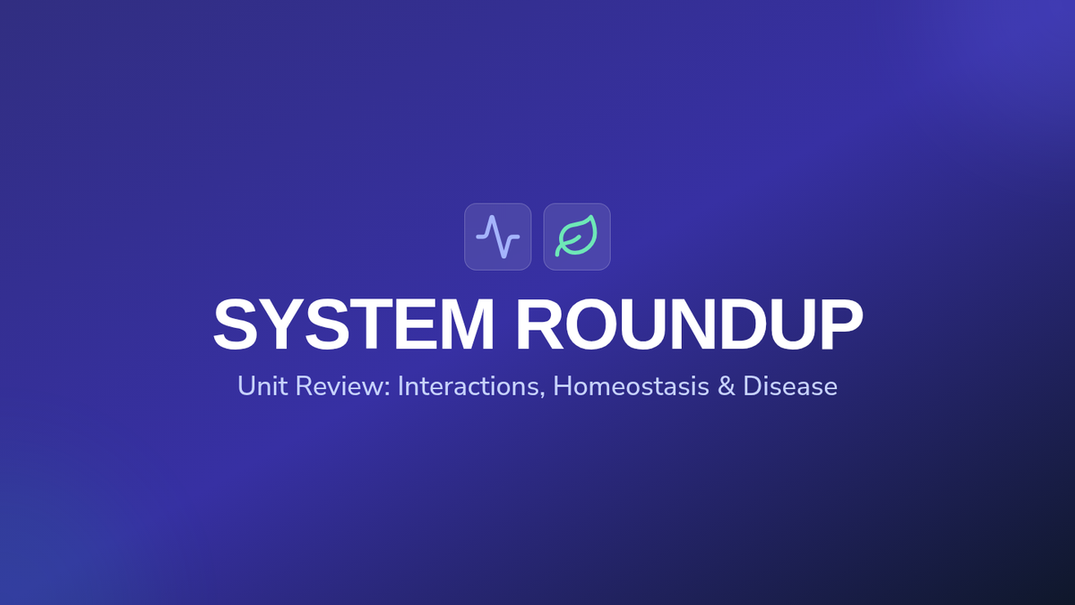 Visual presentation slides for the unit review, focusing on plant responses (thigmotropism), vascular transport, human body system interactions, homeostasis, viral vs. cellular structures, and environmental impacts on enzymes.