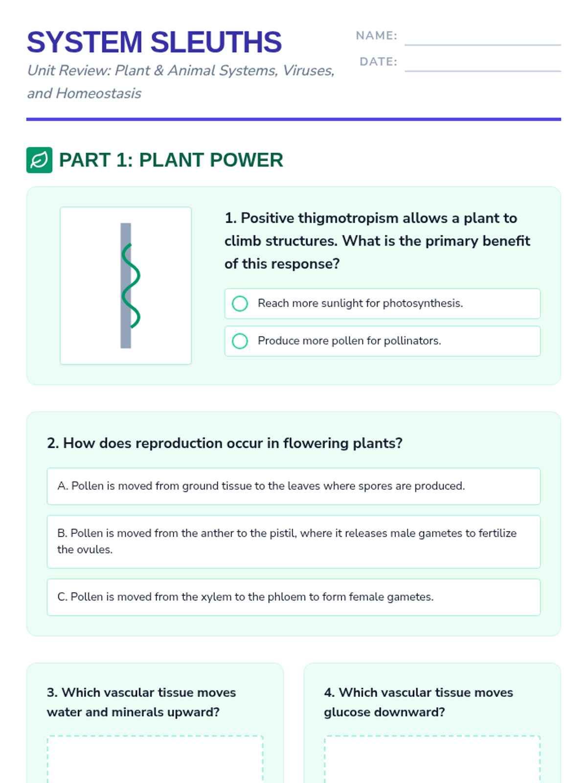 Updated unit review worksheet for body systems, now including plant reproduction and clear space for all required student responses.