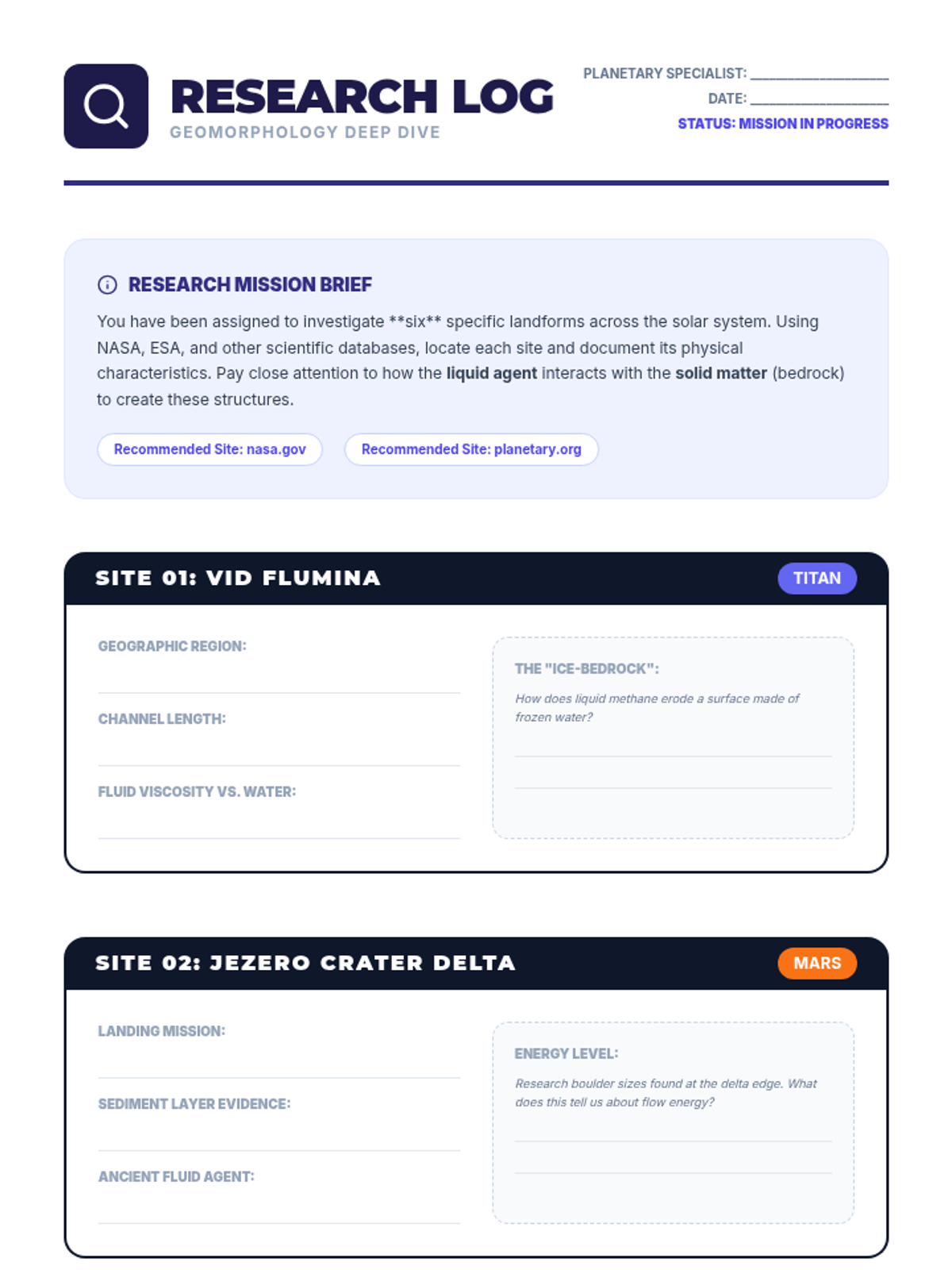 A multi-page independent research log where students investigate specific landforms across the solar system (Vid Flumina, Jezero Crater, Baltis Vallis, Kraken Mare, Kasei Valles, Hadley Rille) and document their physical properties.