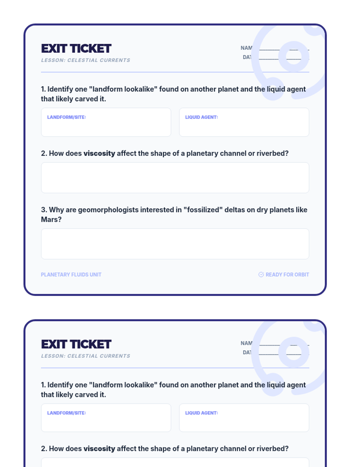A compact exit ticket for the Celestial Currents lesson, featuring 3 critical thinking questions about comparative geomorphology and liquid properties in space.