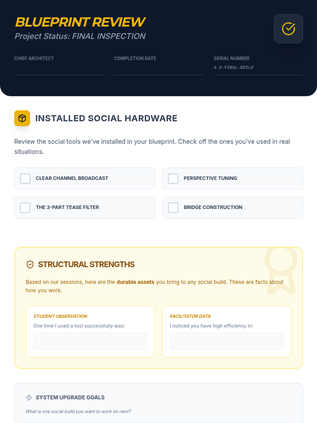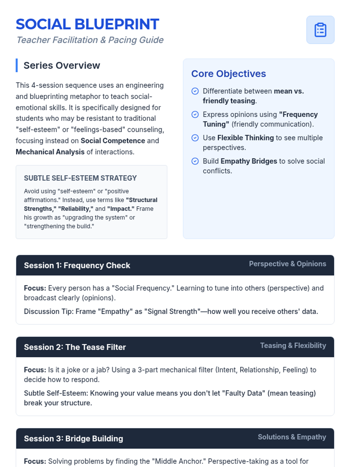 A comprehensive facilitator's guide for the four-session 'Social Blueprint' counseling series, detailing the architectural theme, session summaries, and strategies for subtly addressing self-esteem through a focus on competence and 'structural strengths'.