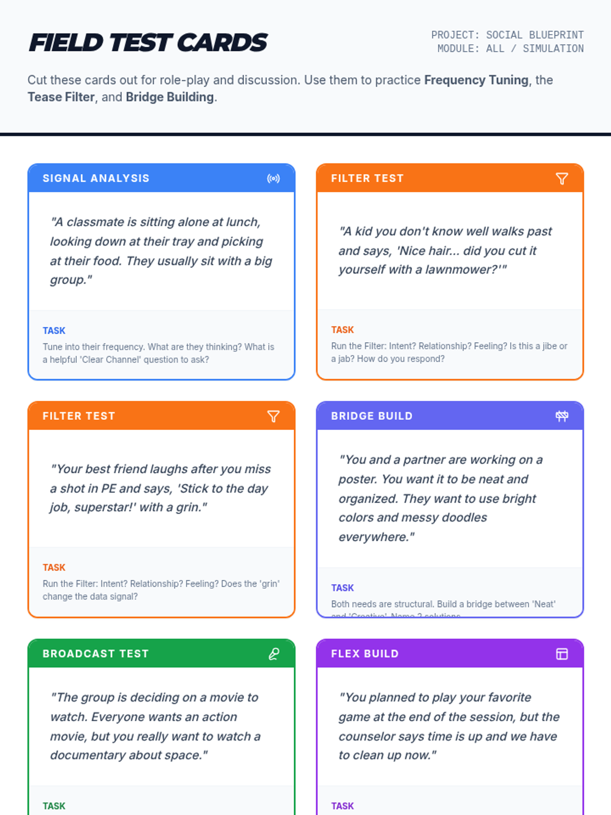 A set of six 'Field Test' scenario cards designed for role-play and discussion, focusing on applying the Social Blueprint skills in real-world situations like teasing, perspective-taking, and opinions.