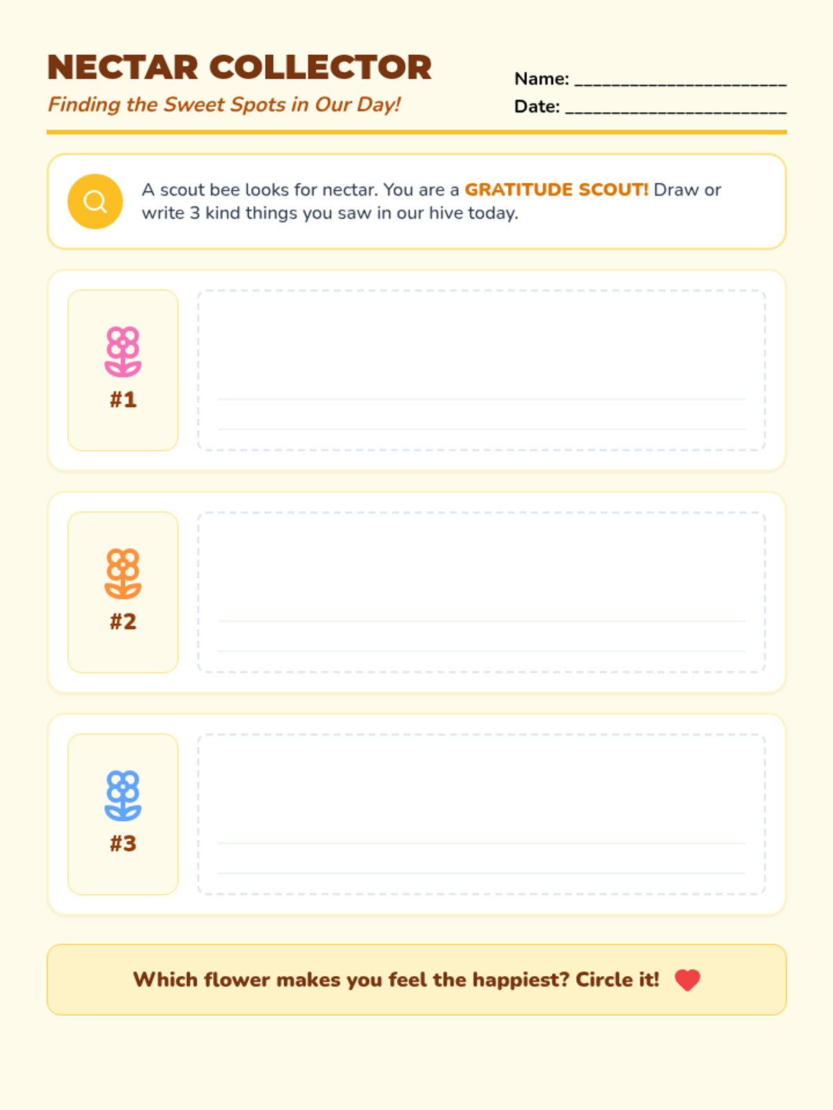 A student worksheet for 'The Gratitude Hive' lesson where children can draw or write three instances of kindness they observed, reinforcing the 'nectar collection' metaphor.