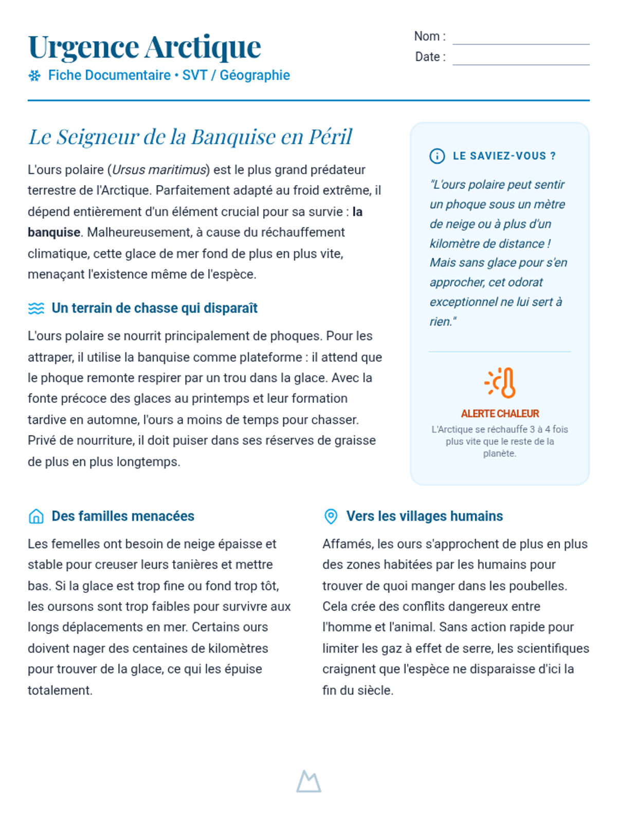 Une fiche documentaire complète sur l'ours polaire et les menaces liées au réchauffement climatique, incluant un texte informatif et des questions de compréhension pour les élèves de 6ème/5ème. Expansion sur deux pages avec des zones de travail aérées.