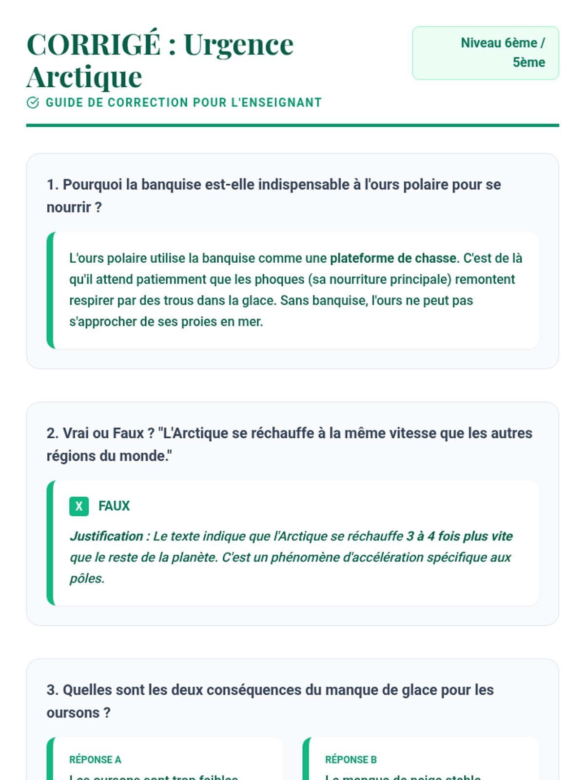 Le corrigé complet de la fiche documentaire "Urgence Arctique", incluant des explications détaillées et des notes pédagogiques pour l'enseignant.