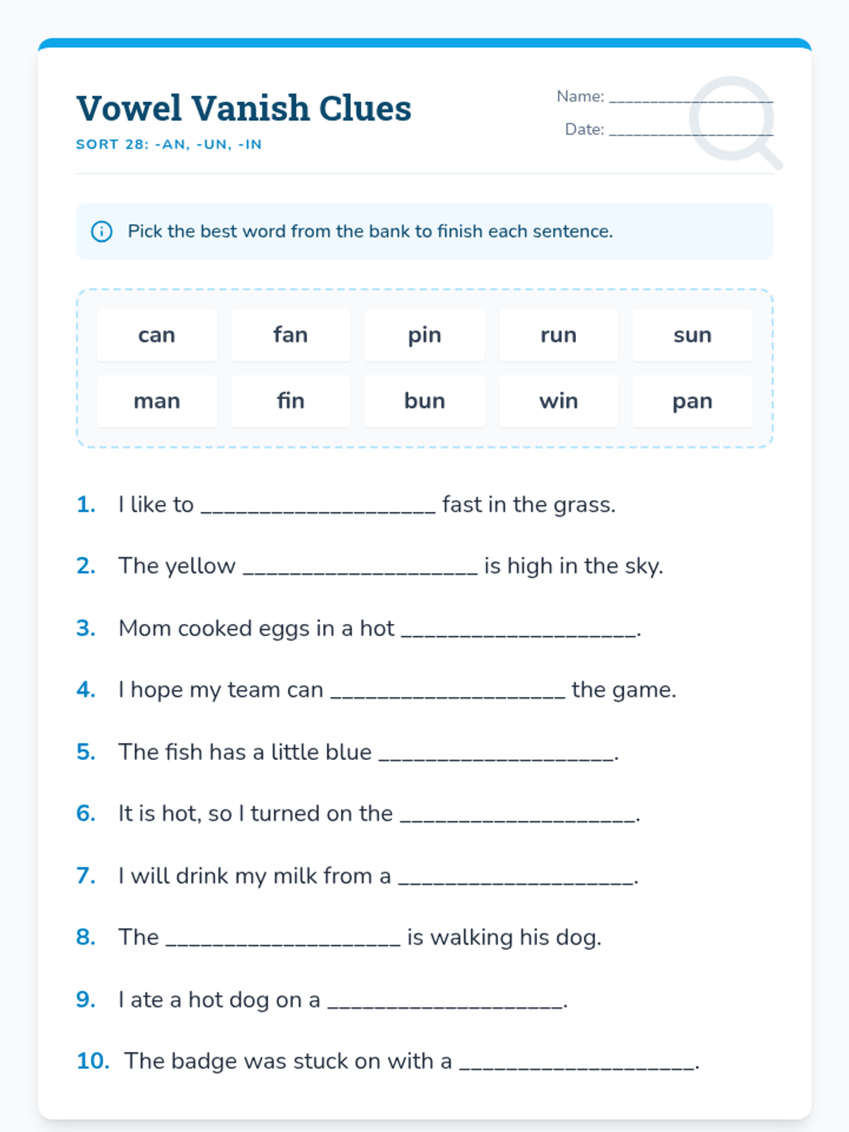 First-grade fill-in-the-blank sentences for Sort 28 (an, un, in) with a Vowel Vanish theme and word bank.