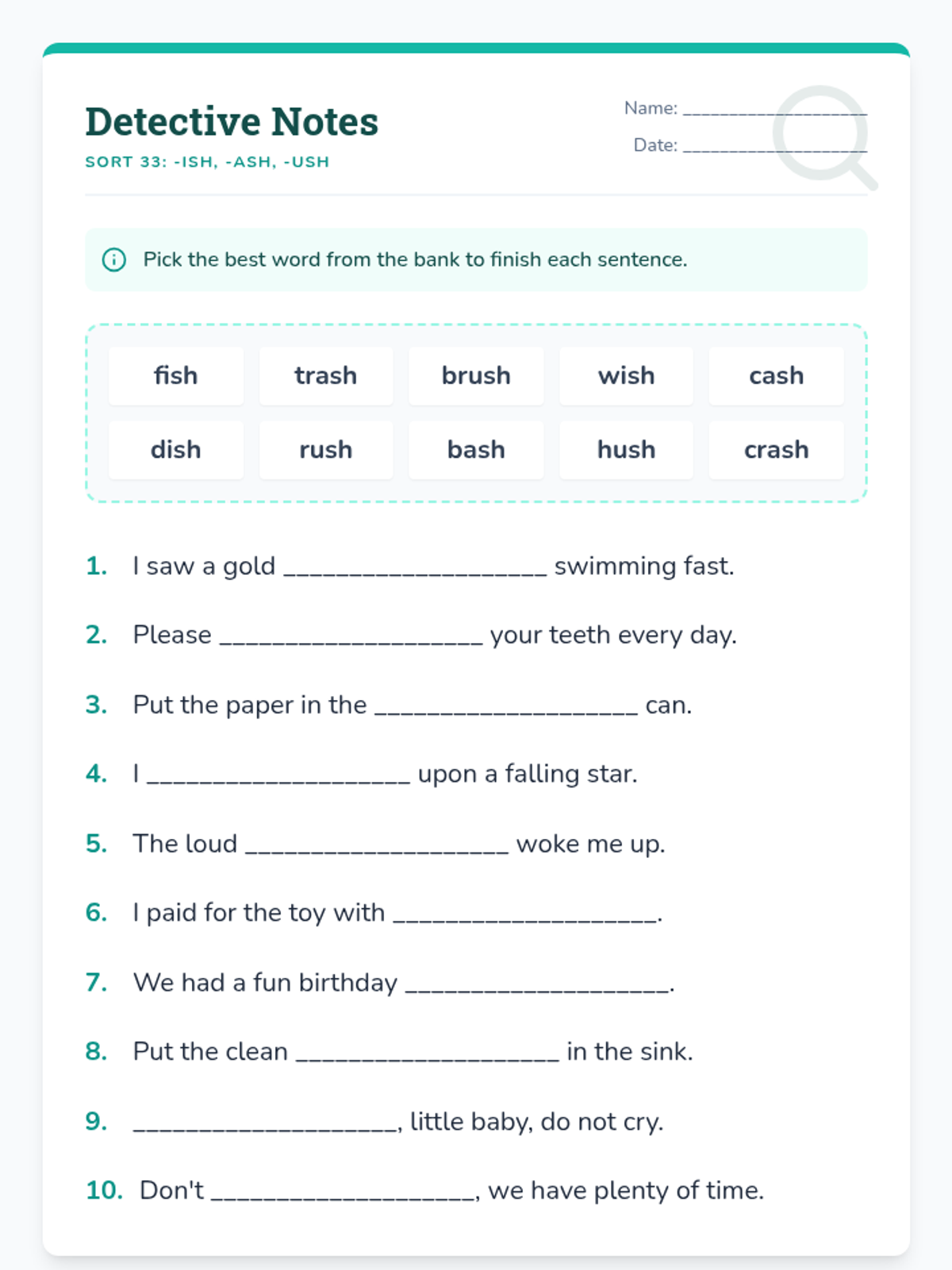 First-grade fill-in-the-blank sentences for Sort 33 (ish, ash, ush) with a Detective Notes theme and word bank.