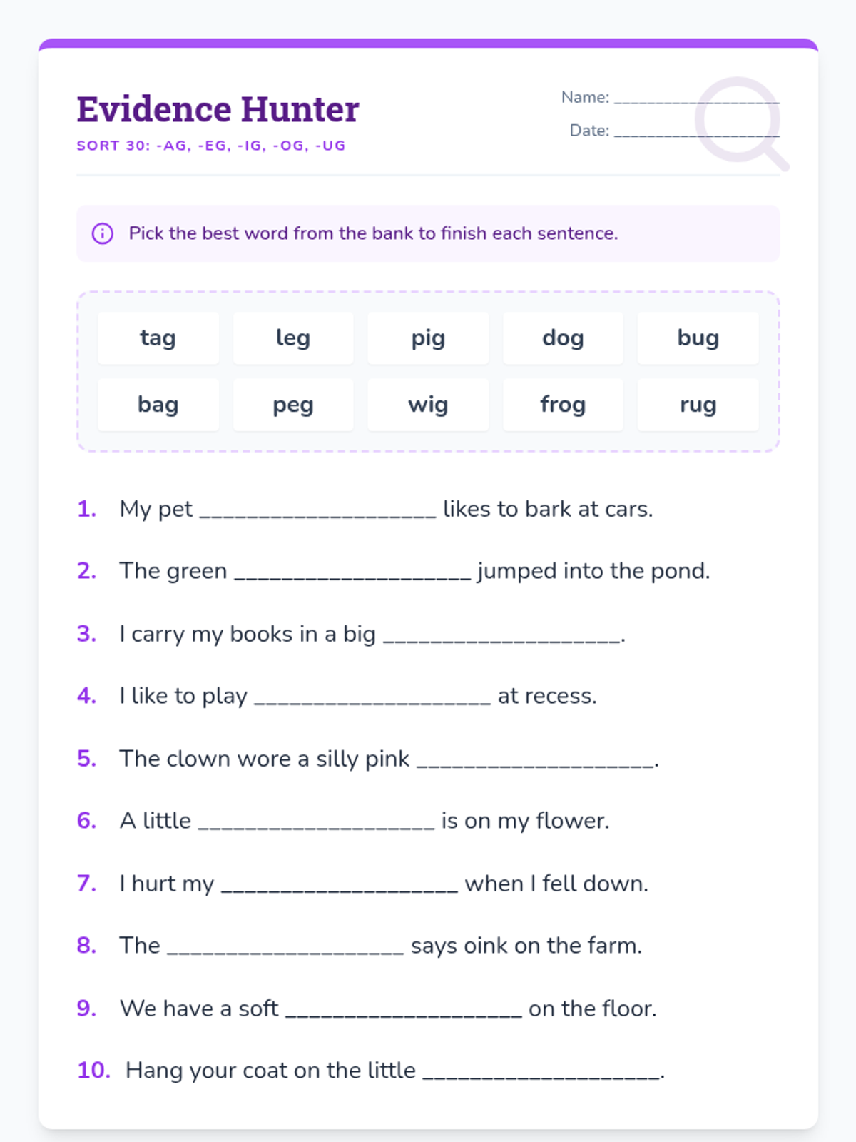 First-grade fill-in-the-blank sentences for Sort 30 (ag, eg, ig, og, ug) with an Evidence Hunter theme and word bank.