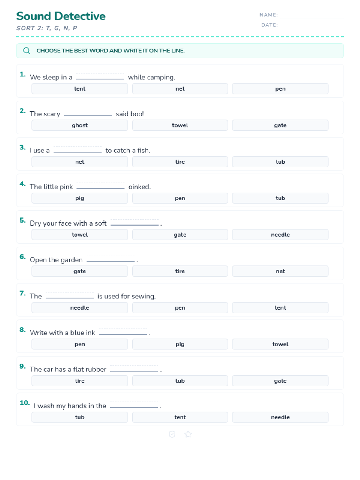 A first-grade level fill-in-the-blank worksheet for initial consonants t, g, n, and p, featuring 10 sentences with multiple-choice word options and solid handwriting lines. All items fit on a single page.
