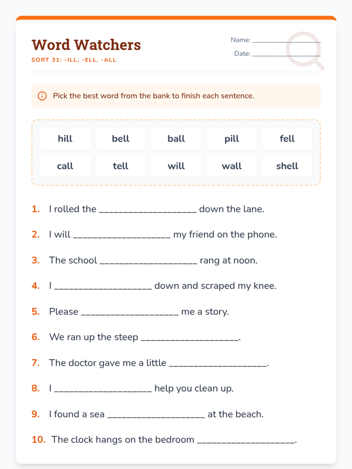 First-grade fill-in-the-blank sentences for Sort 31 (ill, ell, all) with a Word Watchers theme and word bank.