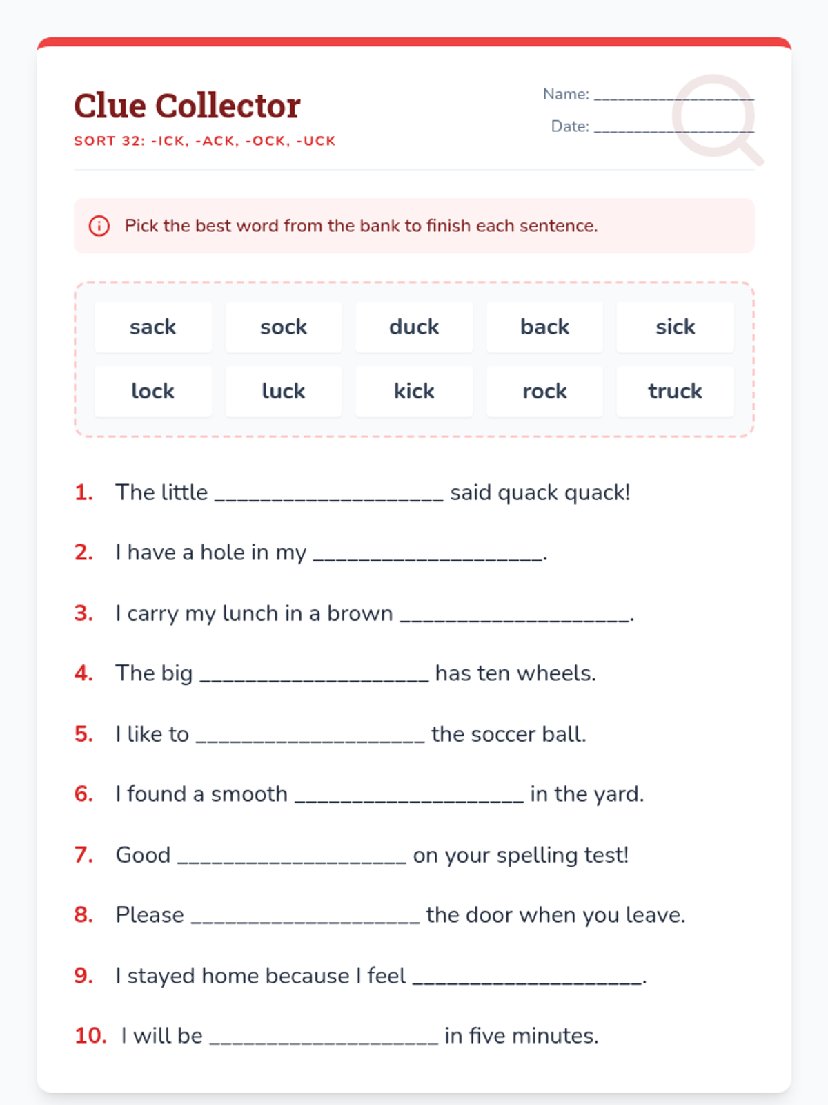 First-grade fill-in-the-blank sentences for Sort 32 (ick, ack, ock, uck) with a Clue Collector theme and word bank.