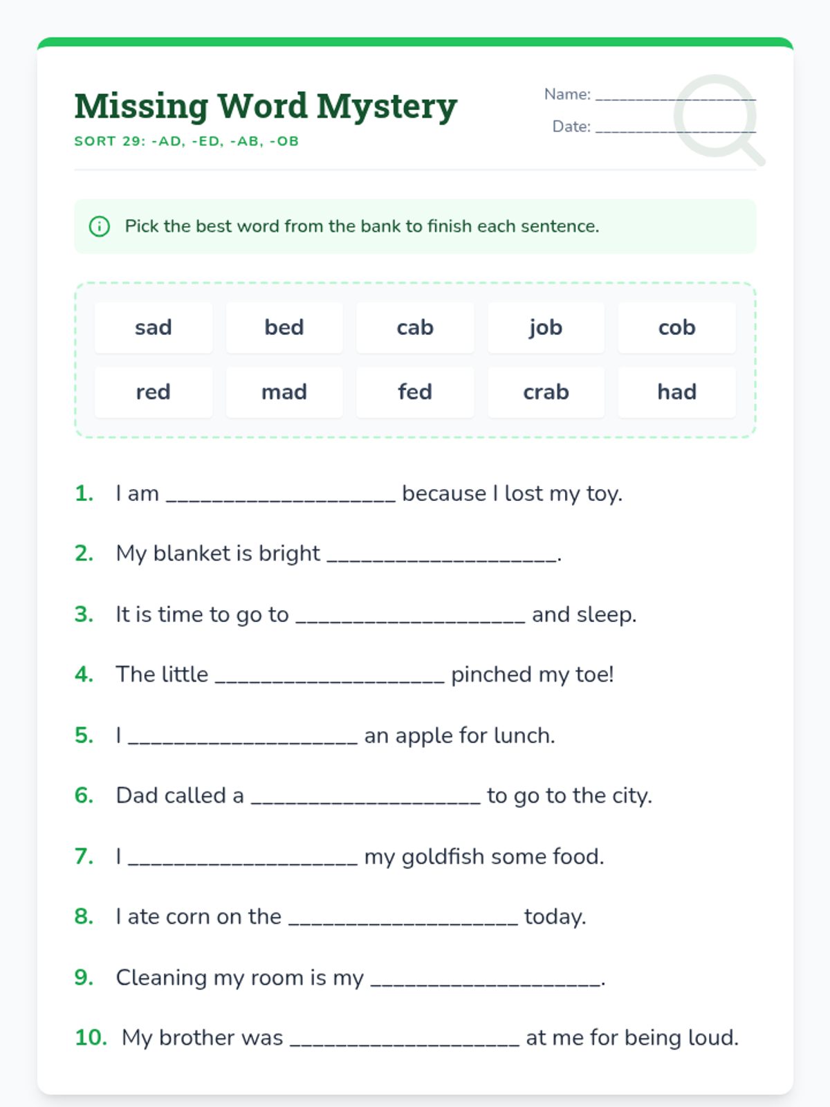 First-grade fill-in-the-blank sentences for Sort 29 (ad, ed, ab, ob) with a Missing Word Mystery theme and word bank.