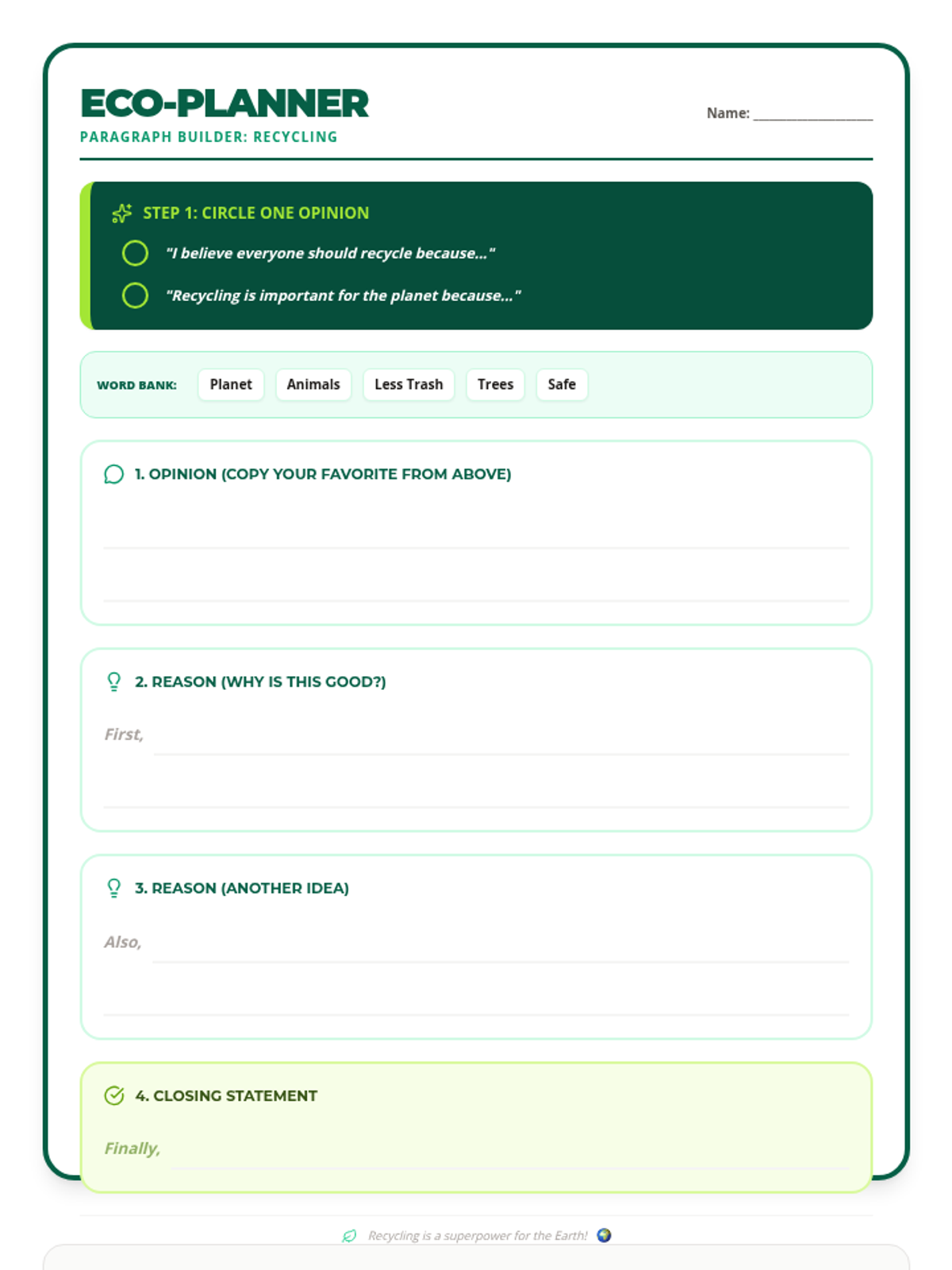 A highly scaffolded persuasive writing graphic organizer for 5th-grade emerging ELL students. Features simple sentence frames, a word bank, and transition words embedded in the work areas to help students build a basic paragraph about recycling.