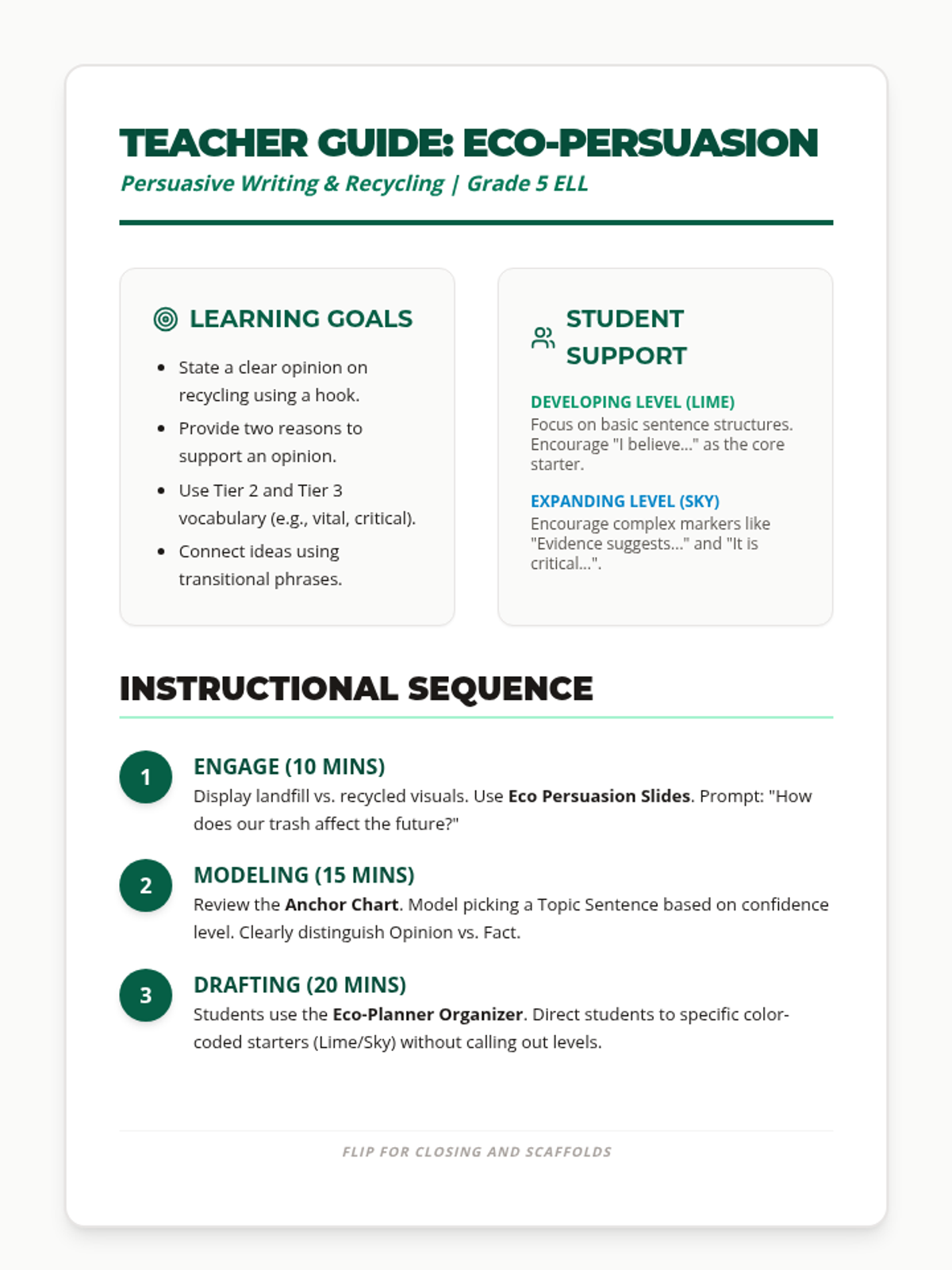 A step-by-step teacher guide for leading a 5th-grade persuasive writing lesson on recycling. Includes learning goals, pacing, and specific linguistic scaffolds for ELL learners. Layout has been fixed for better page flow.