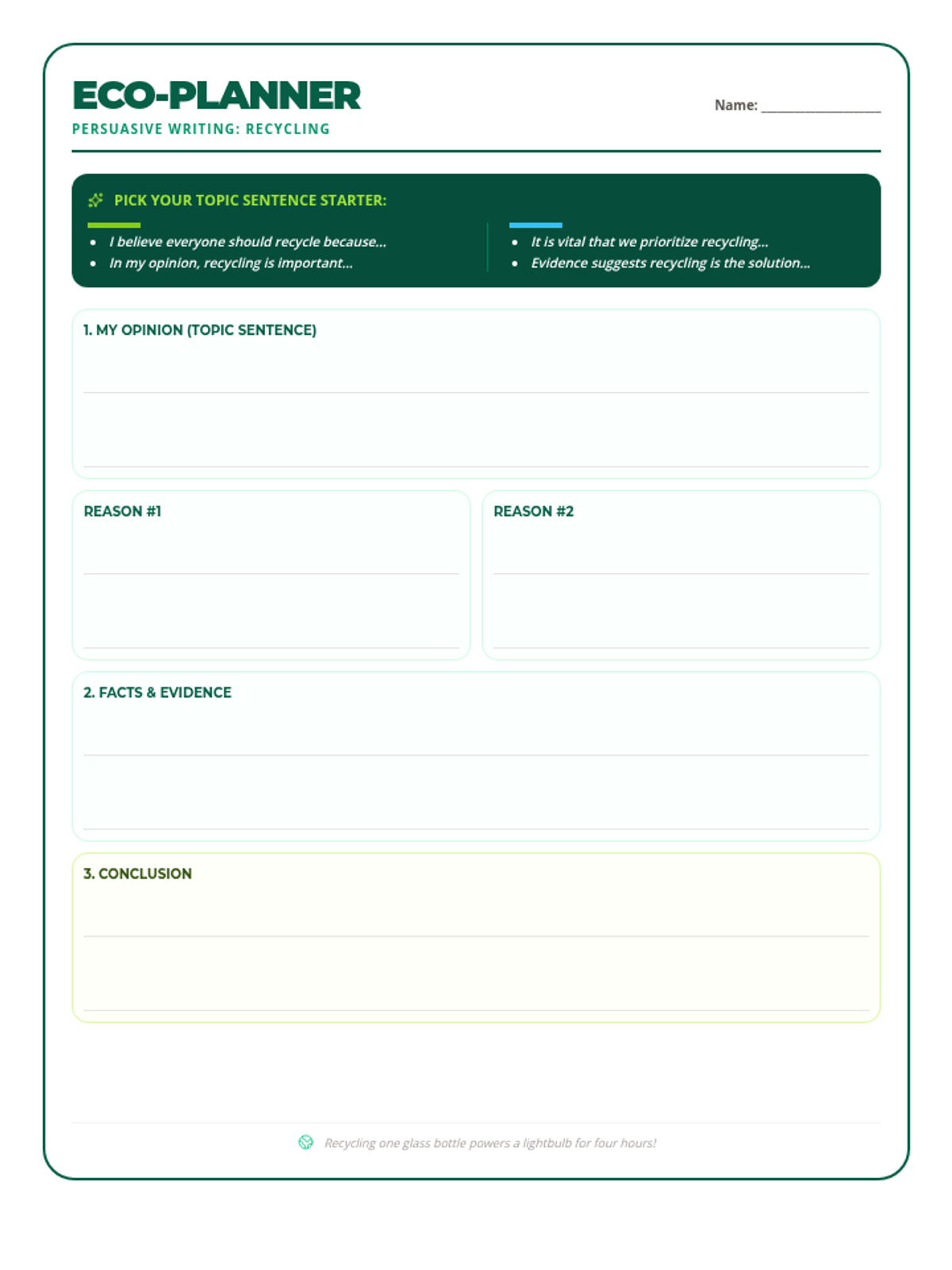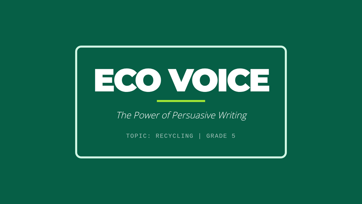 A vibrant presentation for 5th-grade students introducing persuasive writing with a focus on recycling. Features leveled sentence starters for topic sentences without visible proficiency labels. Slide layouts have been optimized for readability and print. Includes a hidden teacher guide slide.