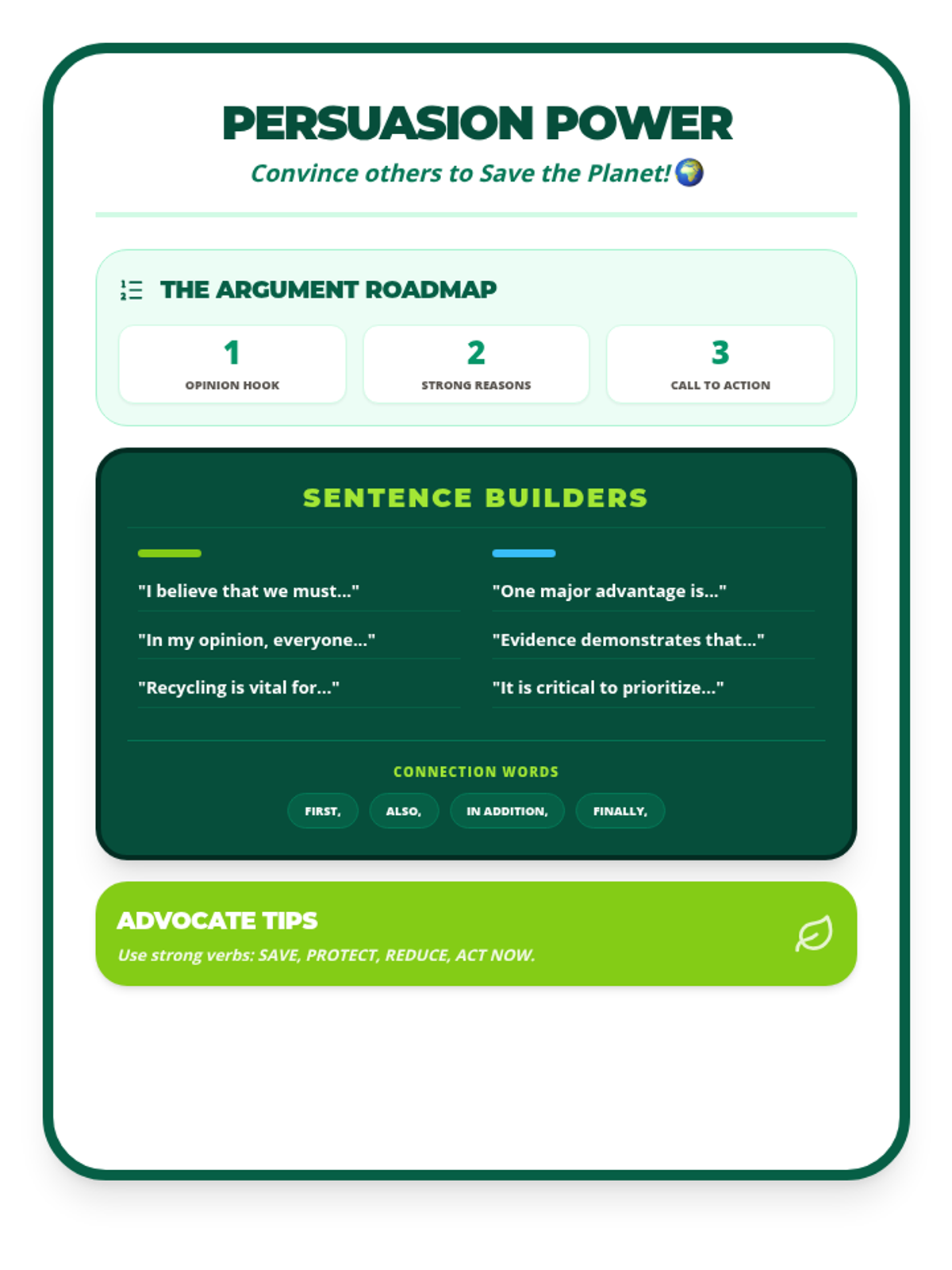 A high-visual anchor chart for persuasive writing about recycling. Outlines argument steps and provides tiered sentence starters for 5th-grade ELLs in a compact, one-page format. Includes a teacher reference page with scaffolded discussion questions. Layout optimized to fit standard printing.