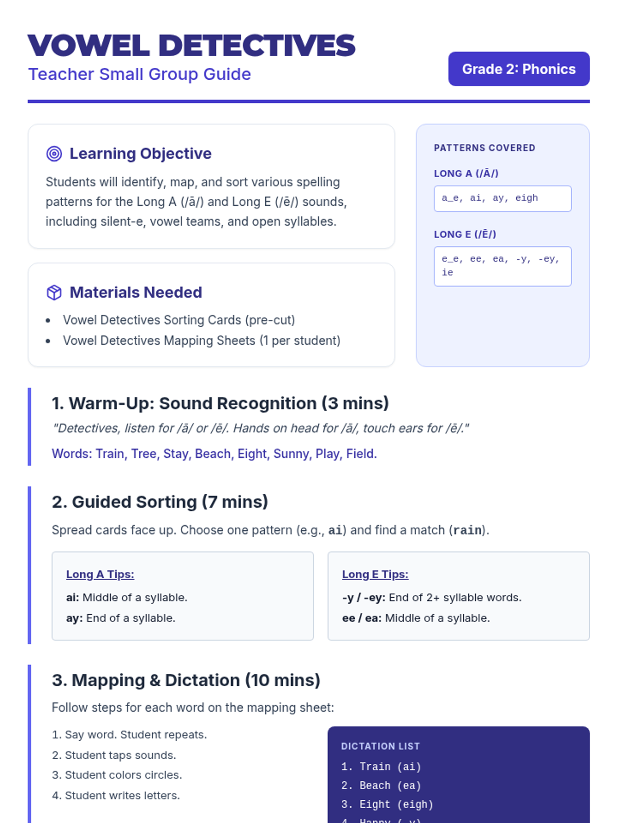 A comprehensive teacher's guide for a 2nd-grade small group phonics lesson focused on Long A and Long E spelling patterns, including dictation lists and instructional steps.