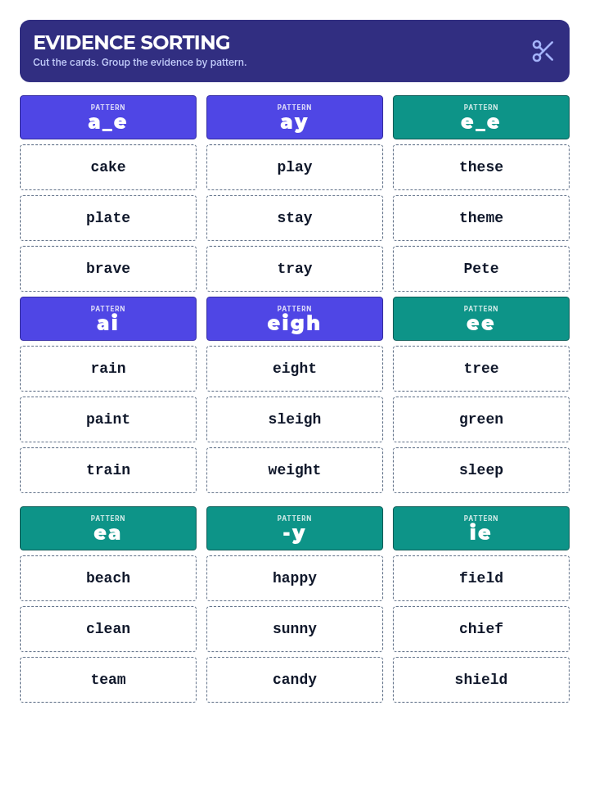 A set of printable sorting cards featuring words with Long A and Long E spelling patterns, designed for hands-on classification activities in small groups.